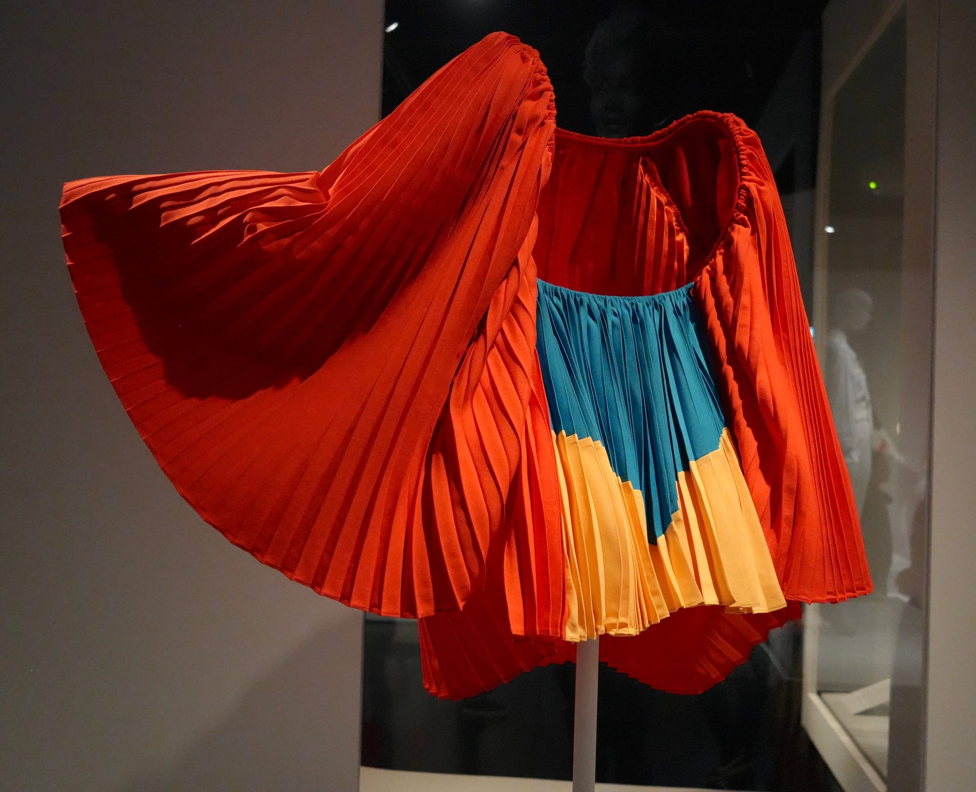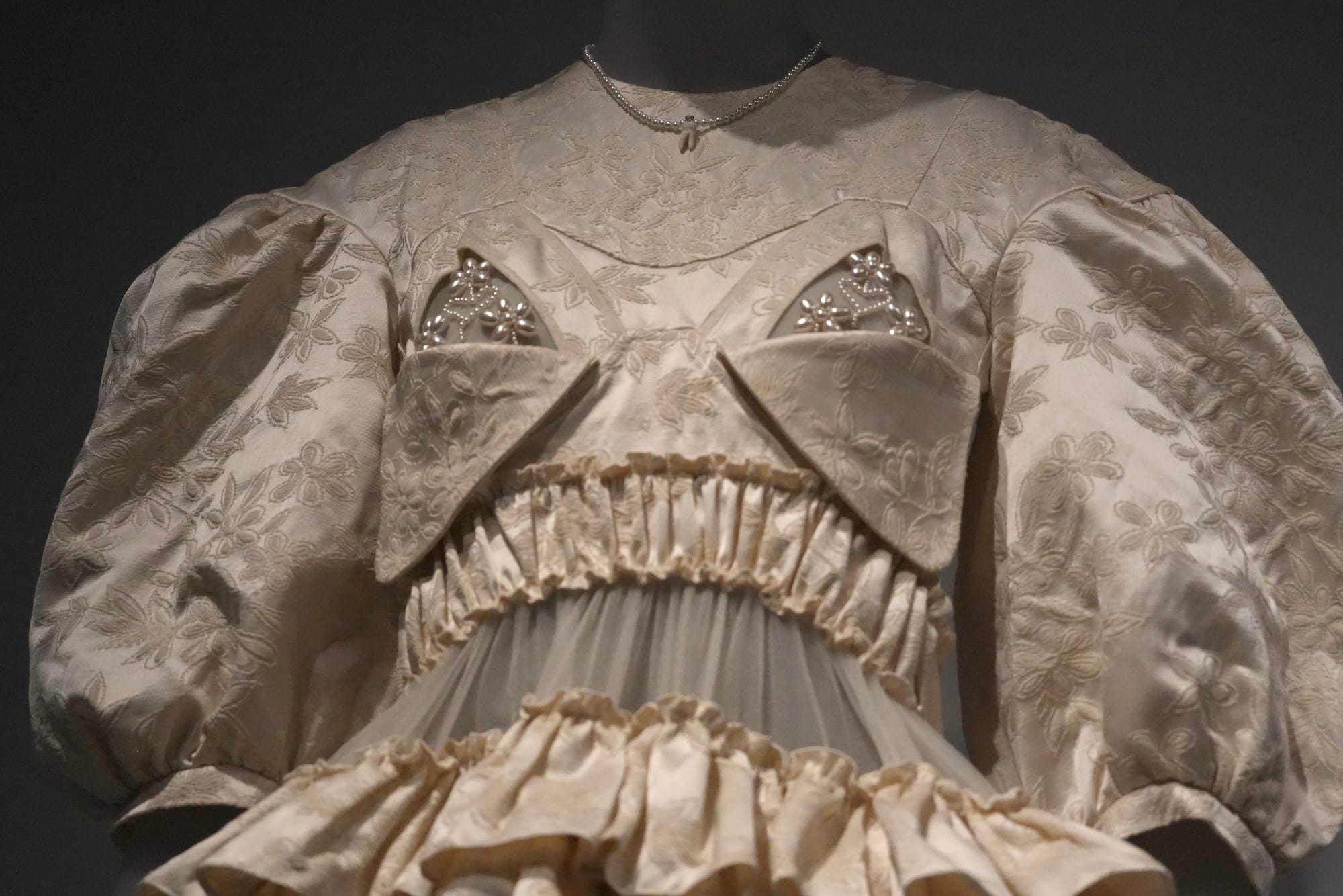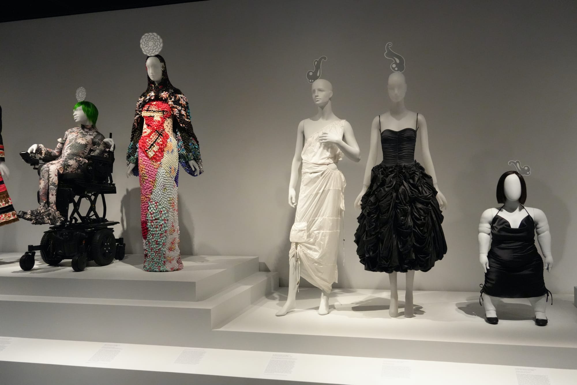 Two mannequins are different from the rest. One is based on Aaron Rose Philip, the model who originally wore the garment, and is positioned in a power wheelchair like the one Philip uses; this is the only mannequin with realistic facial features or hair (a green wig in tribute to Philip’s runway look). The other represents a model with achondroplasia, wearing the “Going Out” dress from Danish label Customiety. While it’s unreasonable to ask the Costume Institute to model every mannequin on an actual person, these two stand out, and draw attention to the otherwise blandly lifeless mannequins and their identical tall, thin frames. This is a show that asks us to consider the individuals who made and wore these clothes, that argues for the liberatory potential of fashion, but uses the same basic, sample-size forms to display those clothes. Presenting the "Kinshasa" dress on a floating form, rather than a full body, was clearly a choice to evoke Mvuemba’s use of the digital, but it is also an interesting choice for the way it allows the garment to speak for itself, and encourages us to imagine the body that it could dress. The Met has used floating forms in other shows to great effect, so why default to the standard Schläppi mannequin here? Only one is larger than the standard small size, and displays a dress made by Ester Manas for her size-inclusive namesake label. It’s paired with a Fortuny Delphos dress — an iconic design that the gallery text refers to as “adaptable” to different bodies because of its shapelessness — so why show it on the typical thin form?