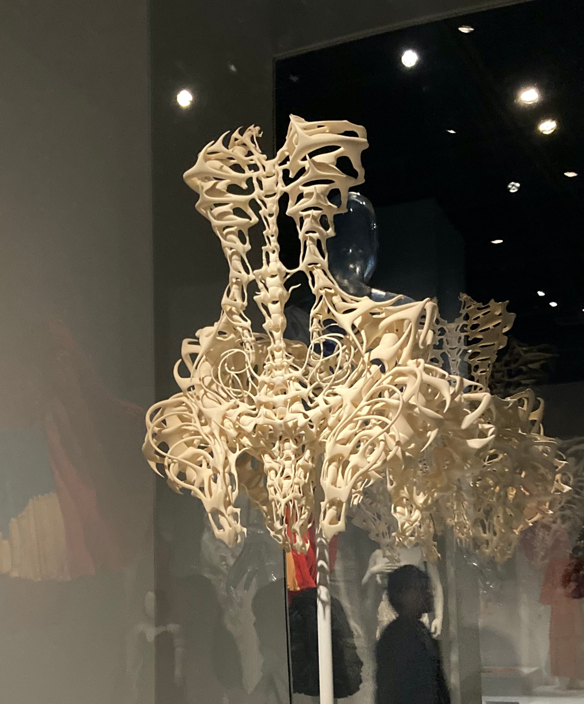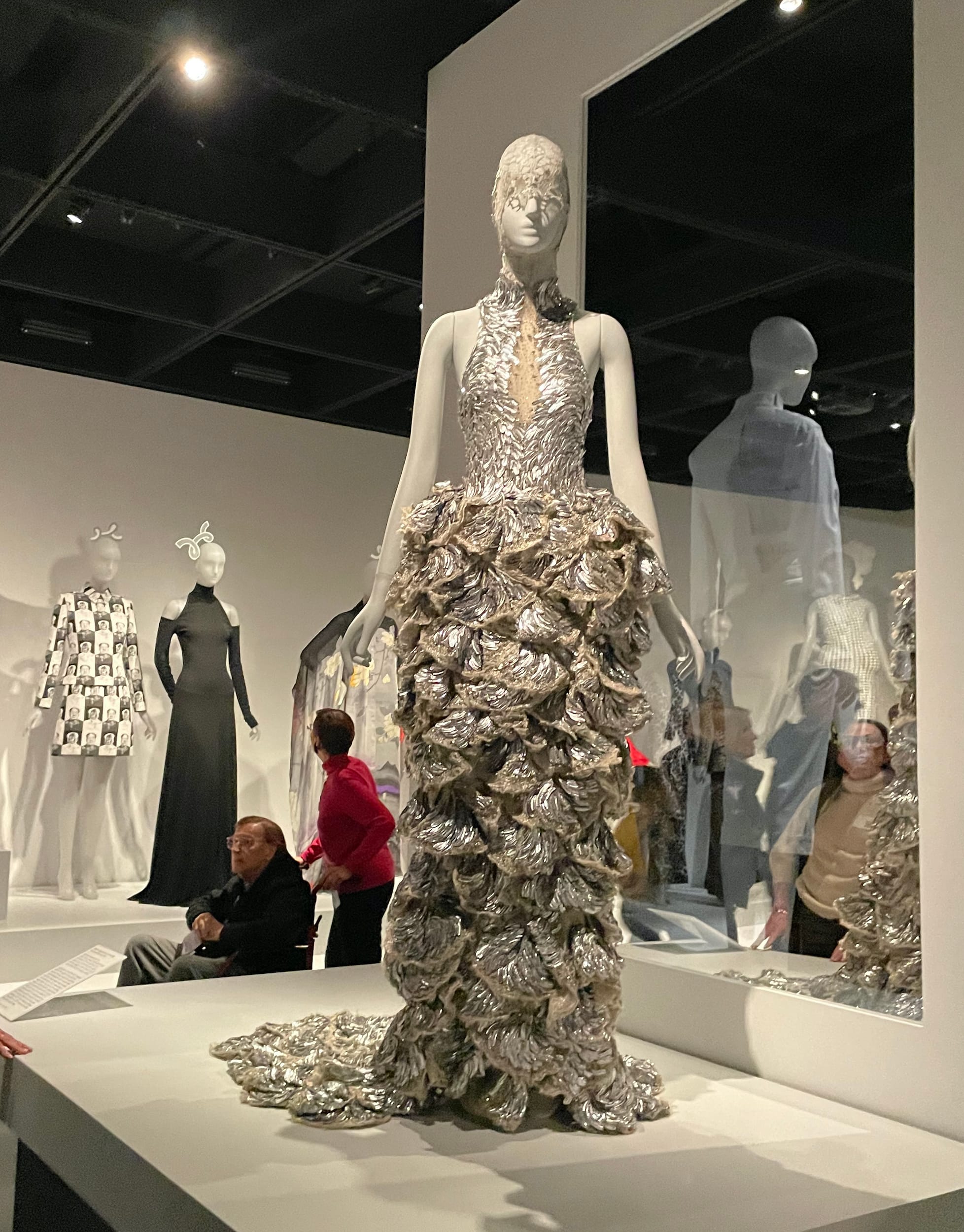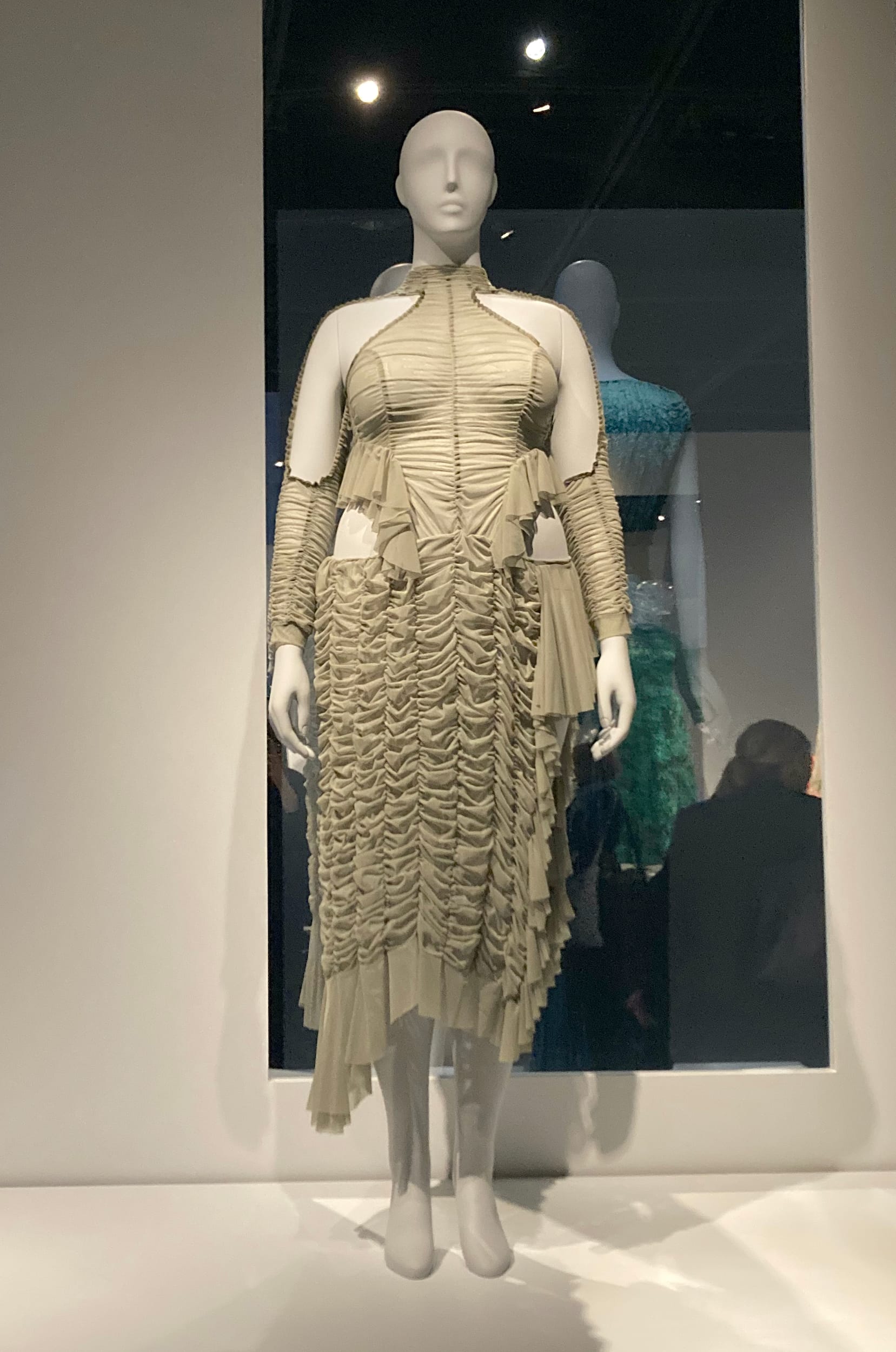 Some truly beautiful garments are shown here: an outrageously tartan Vivienne Westwood suit, a silk mesh dress covered in metal feathers by Sarah Burton for Alexander McQueen, a quilted coat made by the Gee’s Bend Quilting Collective in collaboration with Gabriela Hearst for Chloé. Anifa Mvuemba’s Kinshasa dress from her Pink Label Congo collection is displayed on a frame rather than a body, so that the dress appears to float, in reference to the digital catwalk she created during the height of the COVID-19 pandemic.