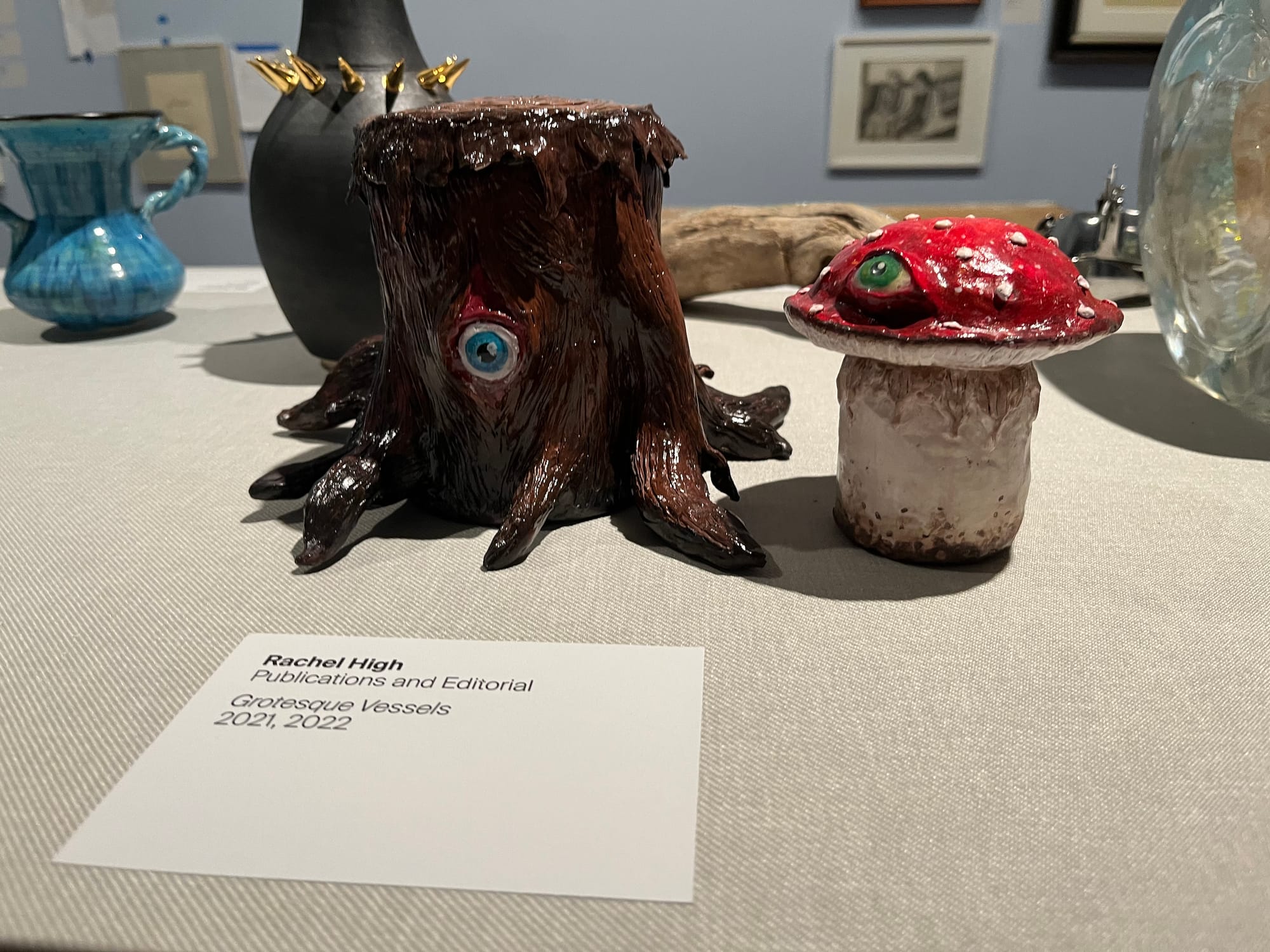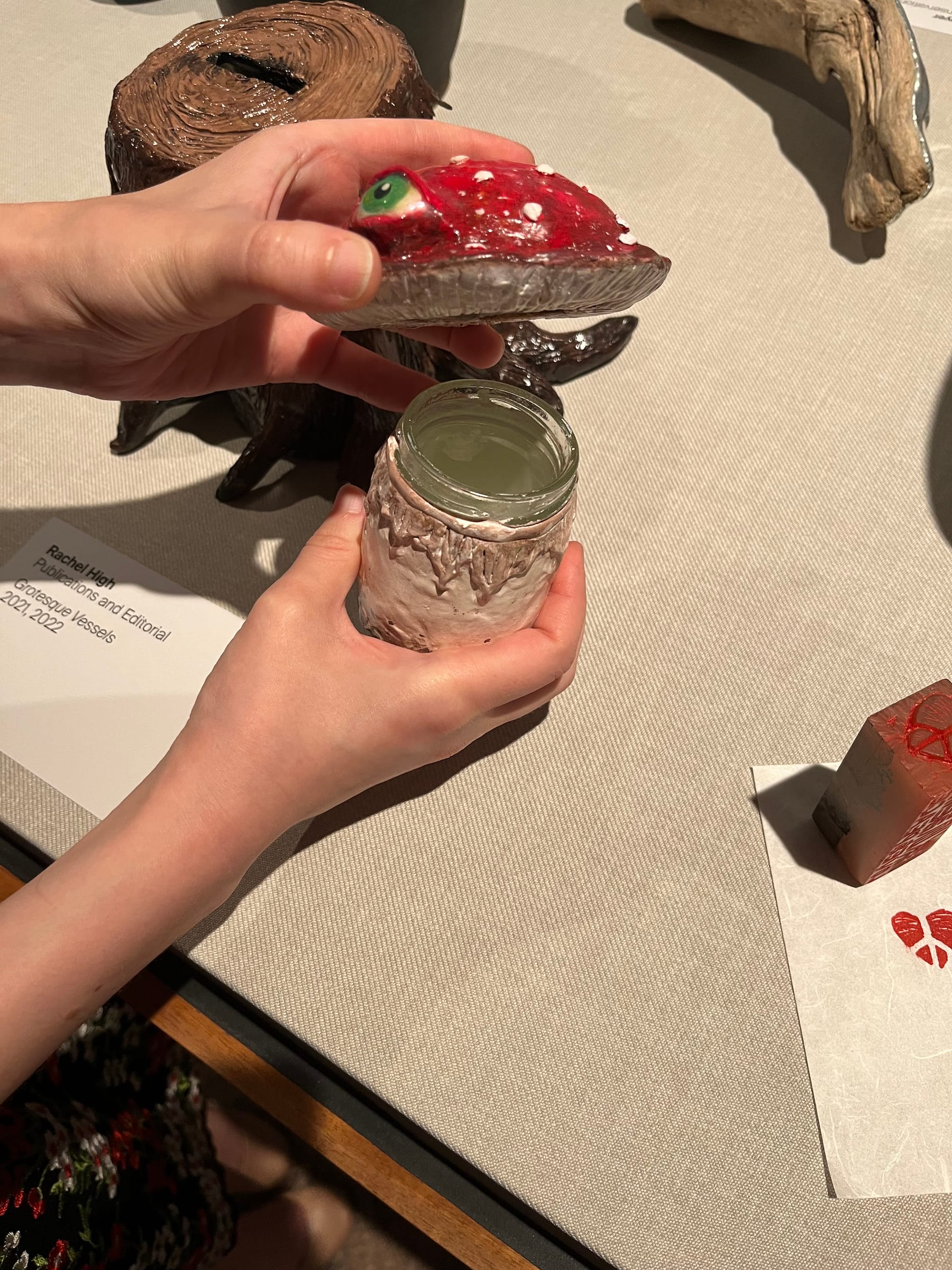 For Rachel High, a manager of editorial marketing and rights who has been at the Met for eight years, it's her second time participating in the employee art show. This year, High contributed two small sculptural vessels to the exhibition. She covered a tin can and glass jar in clay and painted them to look like monsters, brushing resin onto the eyes to create depth. Both of the pieces are functional, and in addition to giving her artwork to friends as gifts, she uses the objects she creates in her daily life.