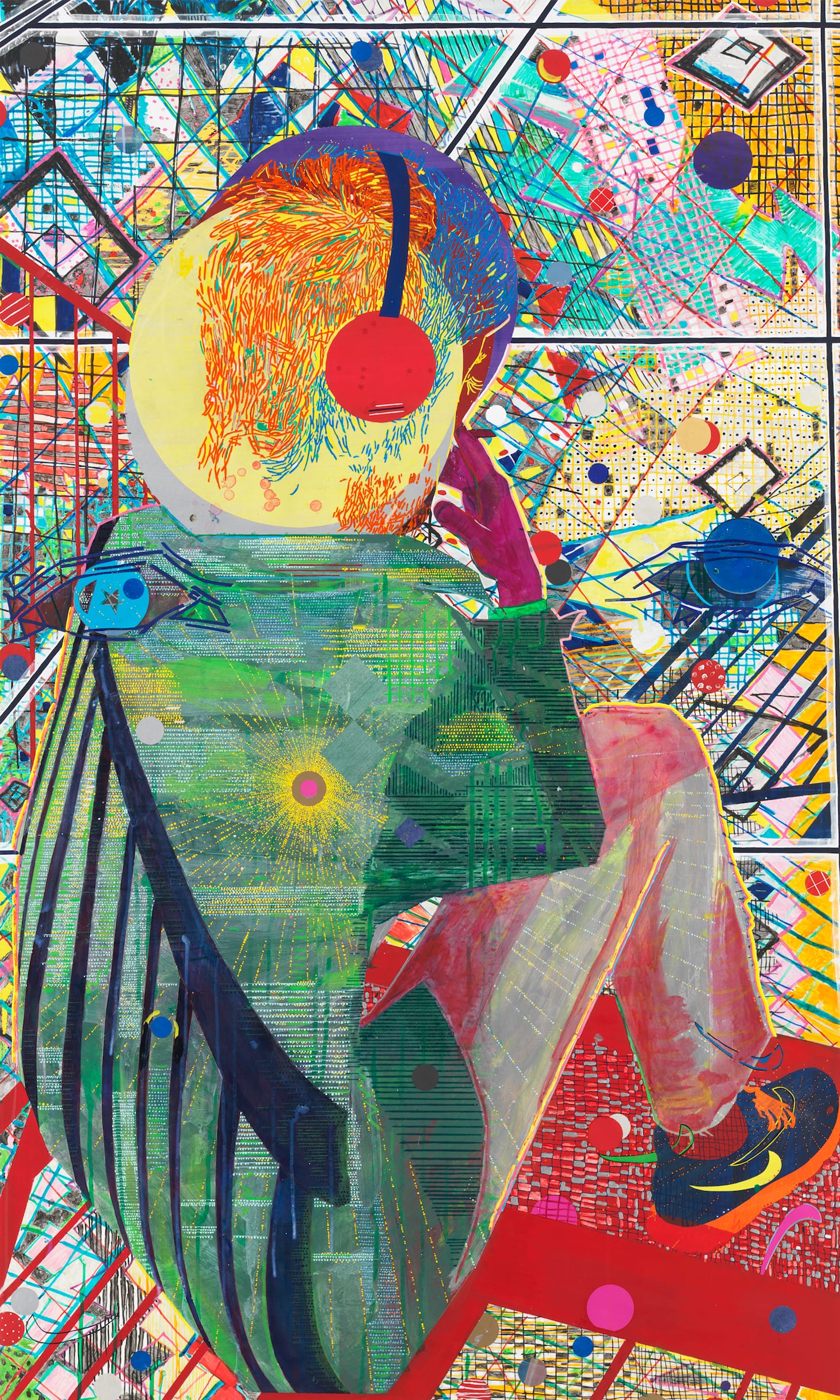We see a cropped view of Murphy in profile; her head is a blue semicircle extending in from the right edge, while her arm is made of four different sized, gray geometric shapes, one of which seems to have been bitten into, leaving a large, jagged opening on the bottom edge of her forearm. While these shapes can be seen as a nod to Murphy’s interest in geometry, they also function as solid forms that are part of the composition’s mixture of patterns, lines, and marks. Fueki’s use of lines and dots imbues the paintings with varying states of heightened opticality.