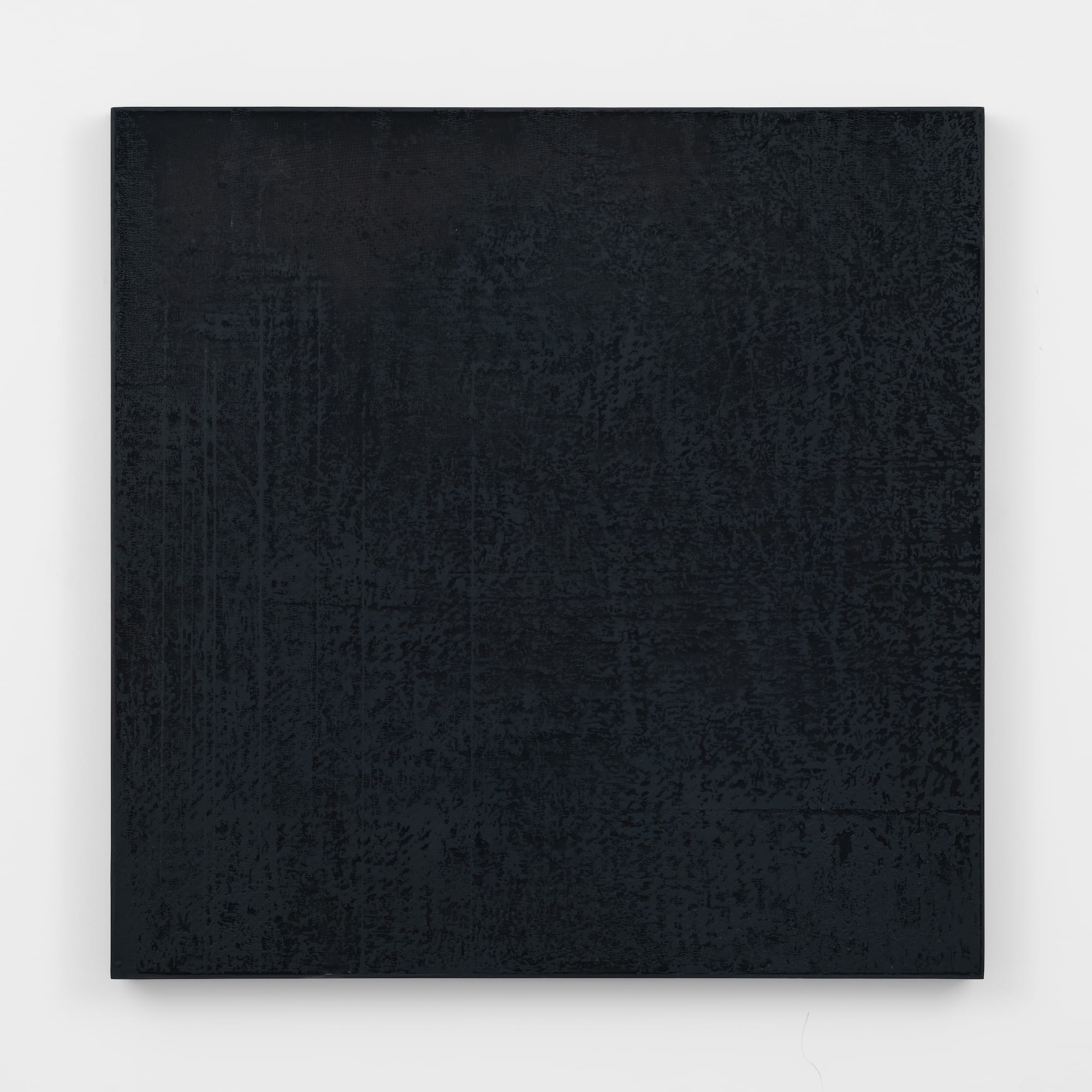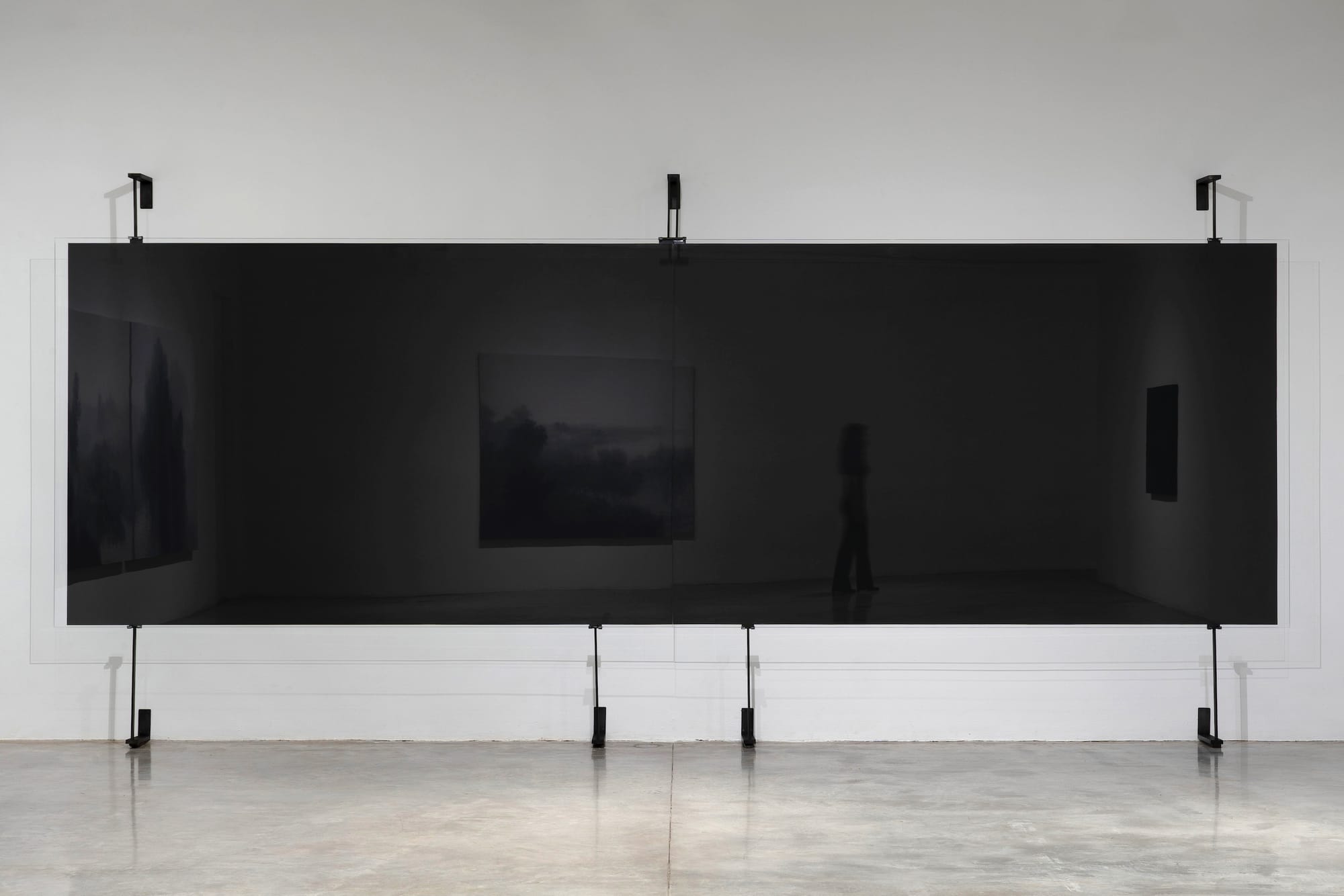 There is no place at Tina Kim Gallery is the artist’s first exhibition at this gallery, and his first in the United States since 2011. Along with 10 paintings, the show includes an installation, “Mistygraphy–Cut Section” (2024), composed of two abutted horizontal sheets of glass supported by a steel structure. Behind the glass, which is a considerable distance from the wall, Rhee has applied black latex to the walls, its size and shape echoing the glass, and spanning nearly the entire wall of one of the two gallery spaces. The glass is transparent enough to see through, while at the same revealing ethereal reflections of the viewer and the entire room. The partially reflected images complicate perception, resulting in a disorienting effect. What does it mean to see through a semi-transparent plane to a black wall or dead end, while catching a glimpse of yourself looking?