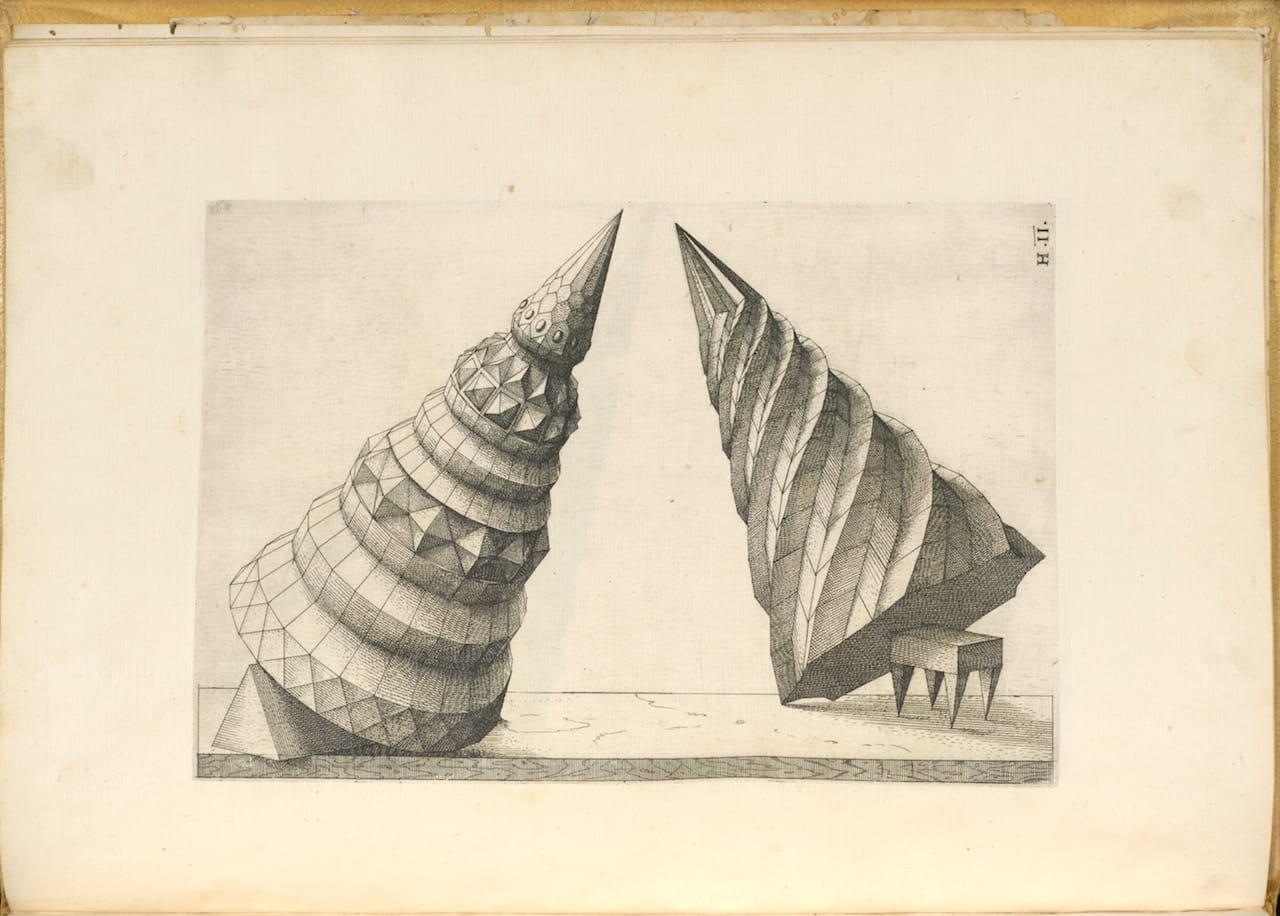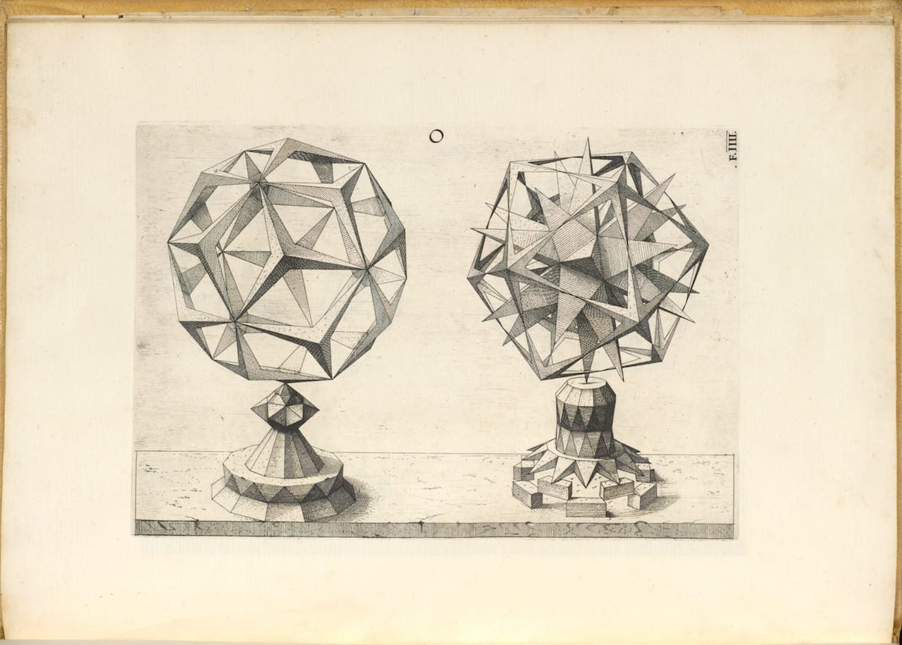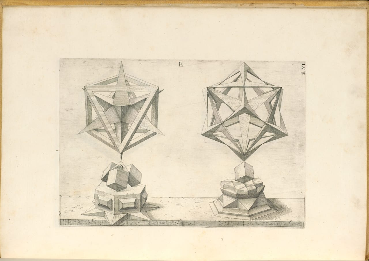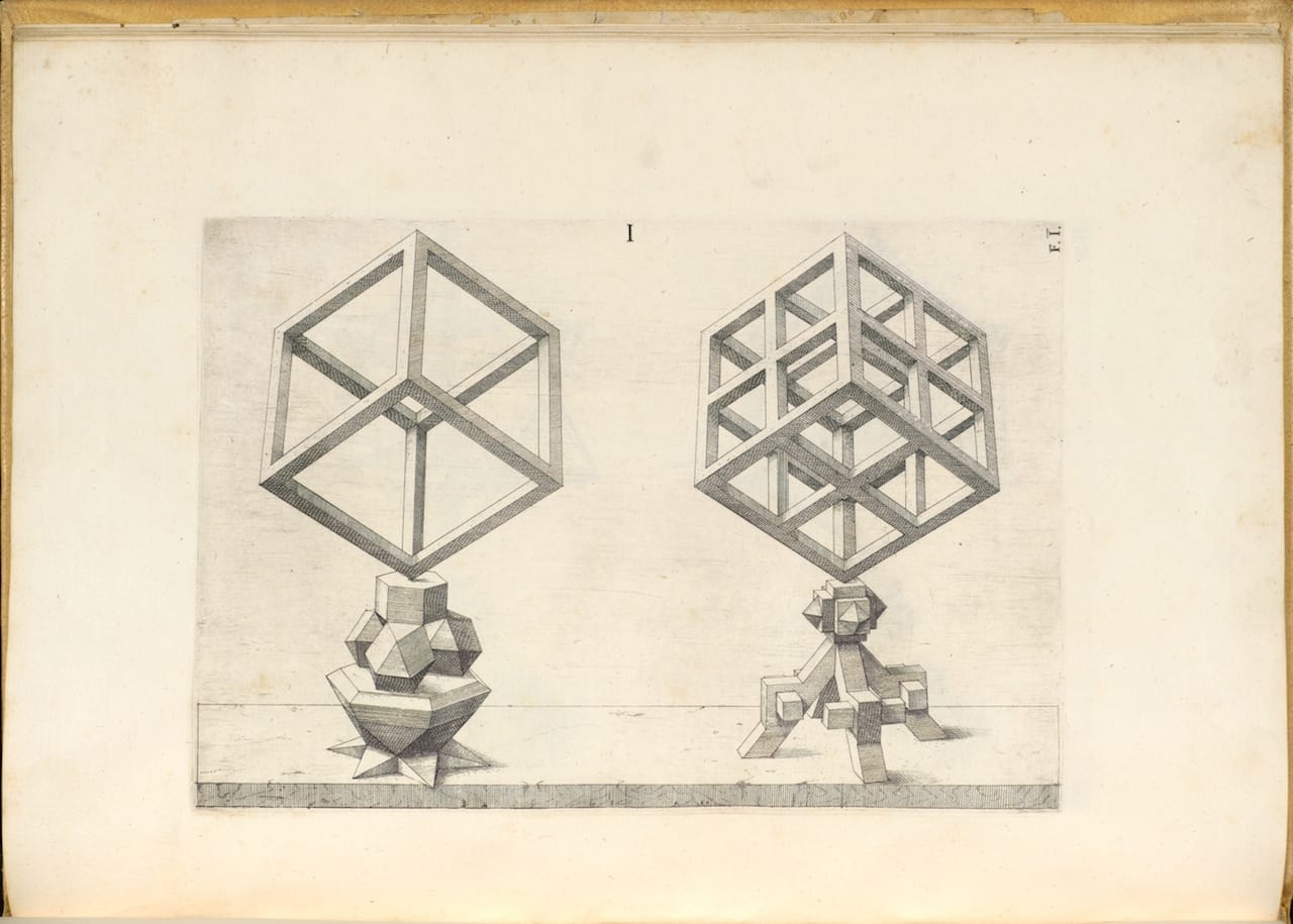 In Perspectiva Corporum Regularium, Jamnitzer rotates and carves each of the solids to demonstrate how they might function as the building blocks of the world. Though science has since demonstrated the atom to be the most basic part of all matter, Jamnitzer’s studies possess a captivating artistic merit. With the manipulation, repetition, and layering of basic shapes, they seem like distant precursors to Minimalism and its concerns.