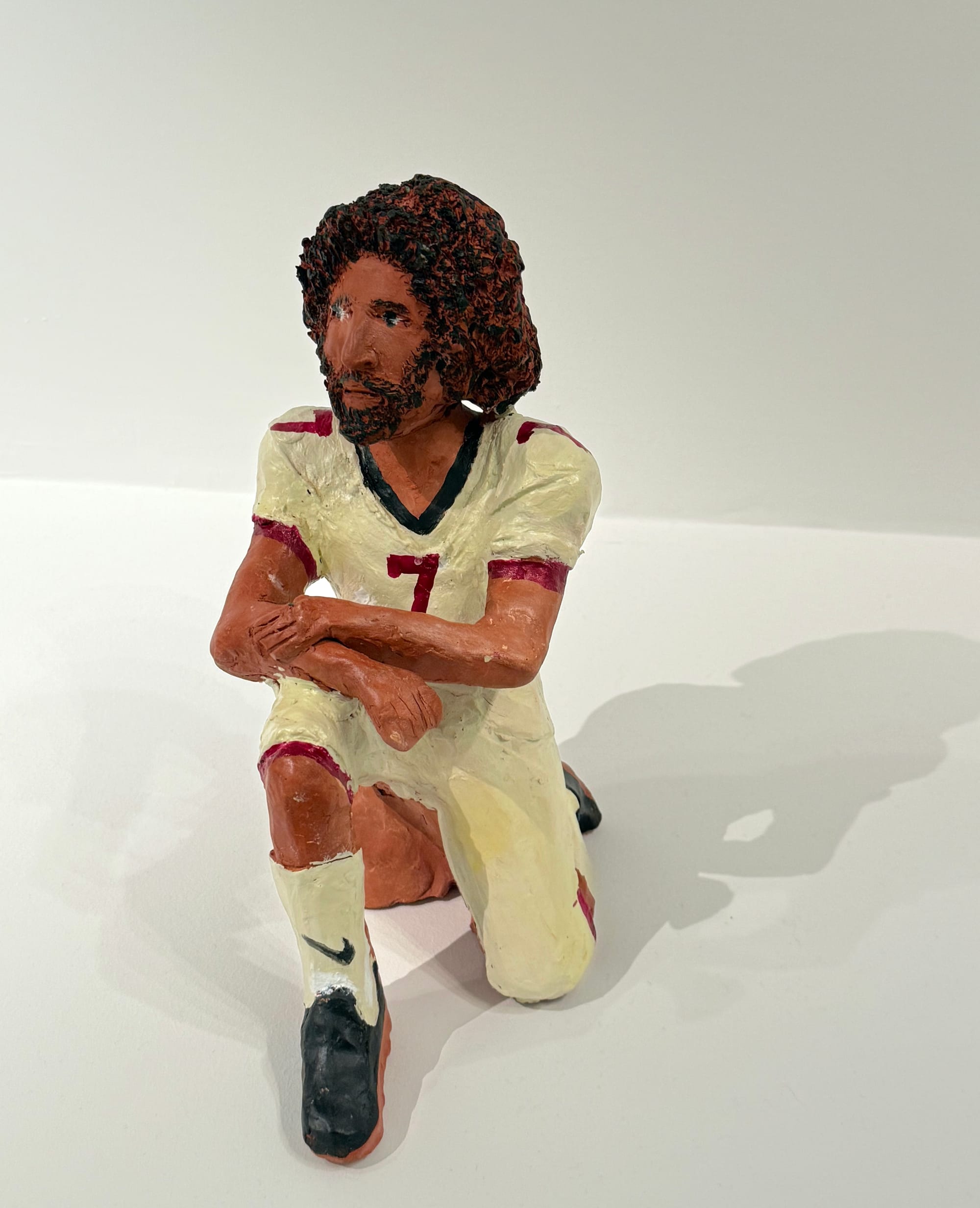 Many of the statuettes portray unnamed Black figures performing universal gestures of care, devotion, and rest. Others respond more directly to the urgencies of our time: “Prayer Changes Things” (2020) shows a worshipper wearing a surgical mask, evoking the ongoing COVID-19 crisis, while “Colin Kaepernick” (2020) is among the show’s most explicitly political works, as the activist-athlete bends down on one knee in uniform. The pose recalls his act of kneeling during the national anthem before a 2016 NFL game to protest police brutality and racism in the US. The physical statement provoked professional retaliation but galvanized the movement for Black lives across professional sports and beyond.