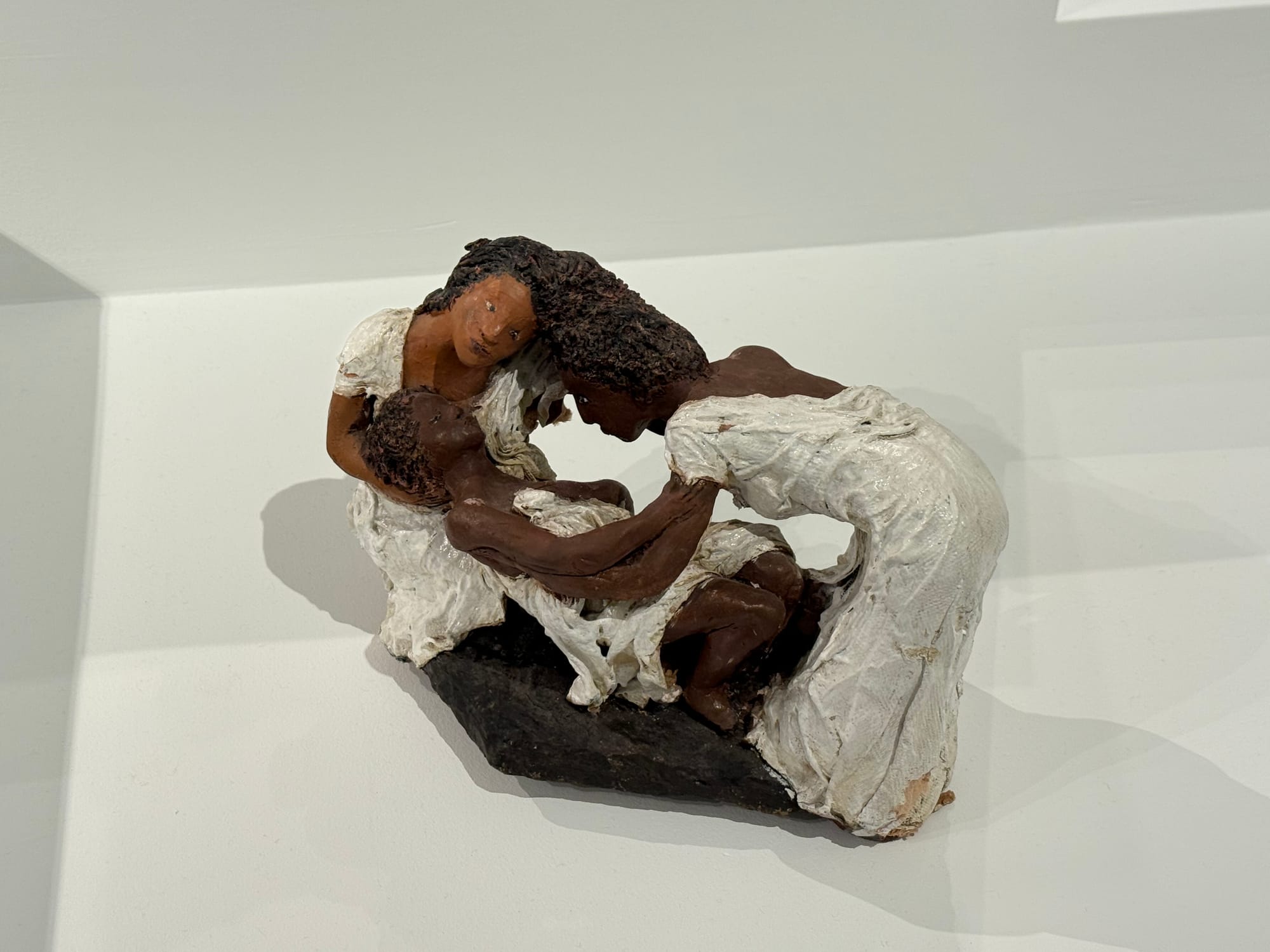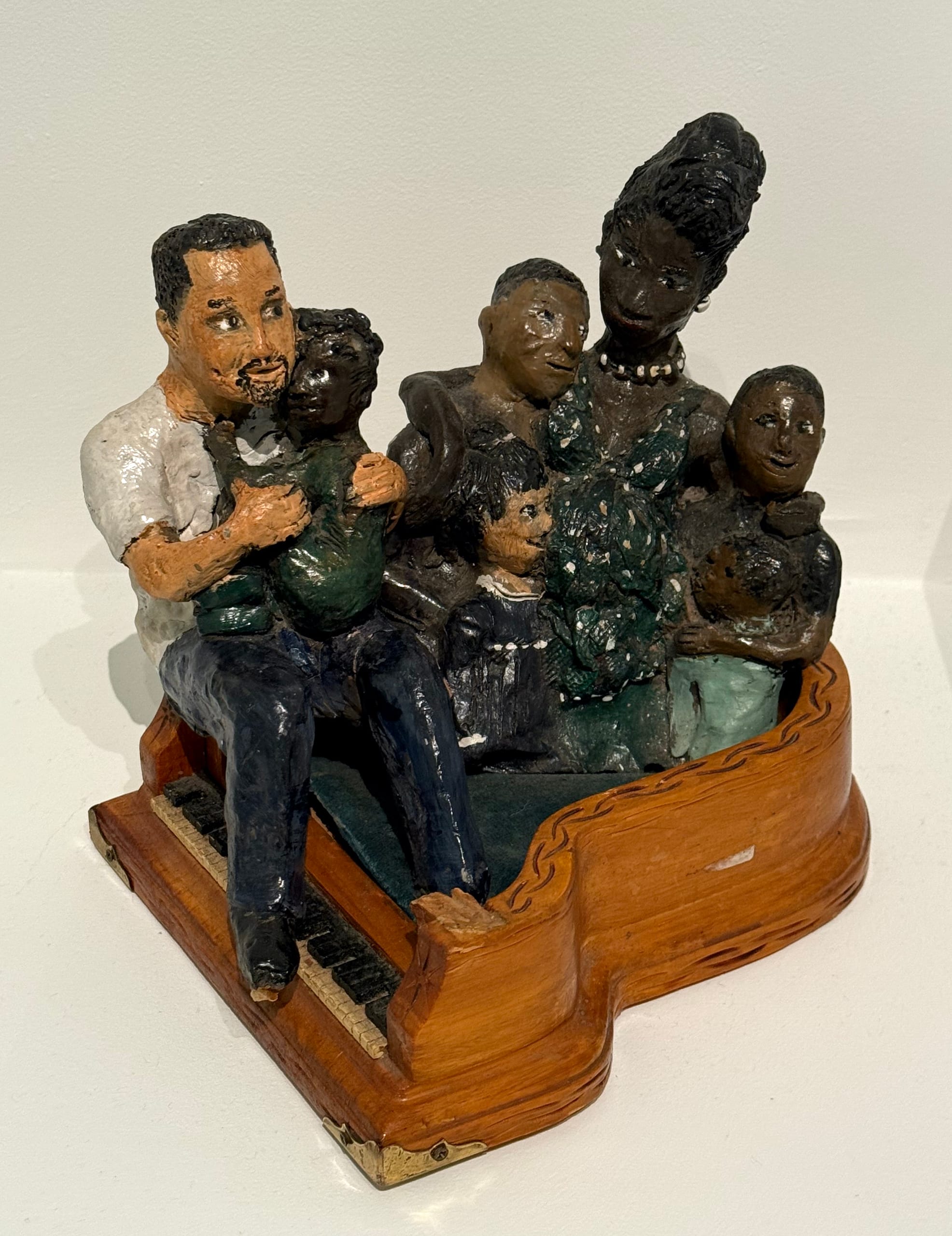 Continuing through the installation, “Sweet Peace” (2007) depicts a hooded woman veiled in gold drapery that pools thickly at her clavicle like cast metal. Across these works, McDonald uses acrylic paint, fabric, and even paper towels to clothe and adorn her subjects. In this way, she transforms everyday found media into sacred figurines. Similarly, “Covered with Love” (2003) reimagines the “Madonna and Child” in clay and cloth — the work portrays a Black mother and infant nestled together in a tender embrace. The theme of familial closeness extends into “The McDonalds” (1998), a sculpted portrait of the artist’s own family, in which four children sit pressed together with their parents atop a piano.