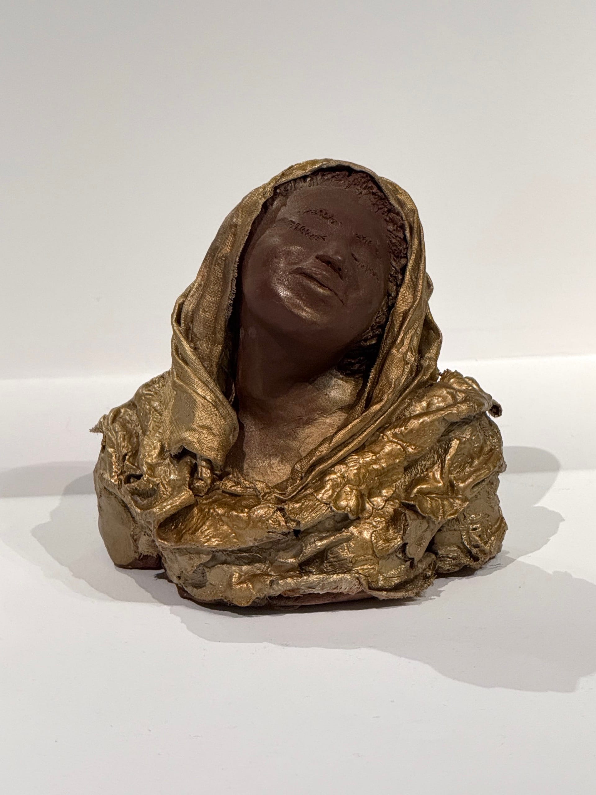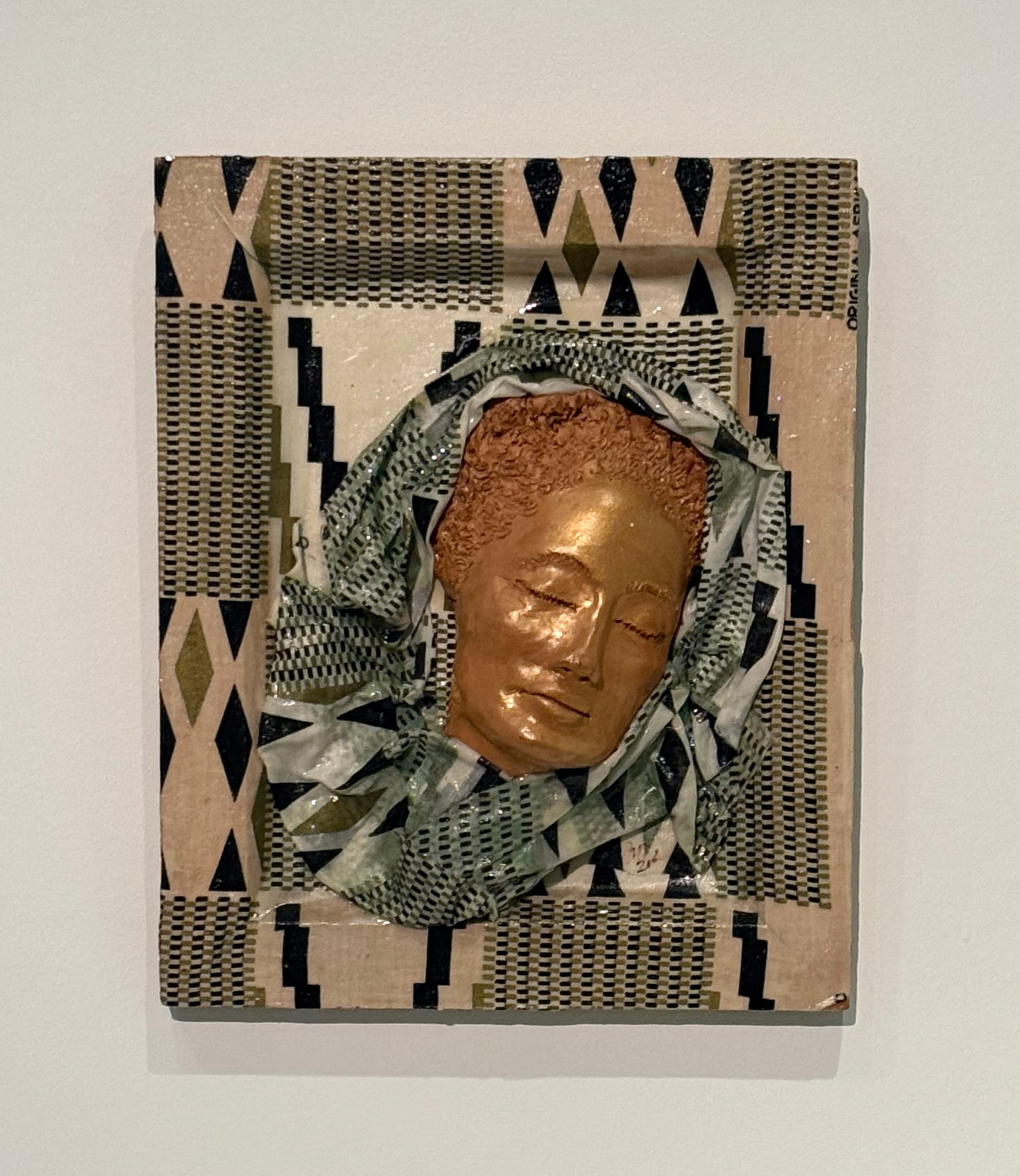 Upon entering the exhibition, viewers encounter “Peace” (2004): a gold face nestled in African fabric, framed by a similar print and mounted on the wall. The folds of the material suggest both a head wrap and a halo, accentuating the sacred aura of the figure seemingly suspended in peaceful repose.