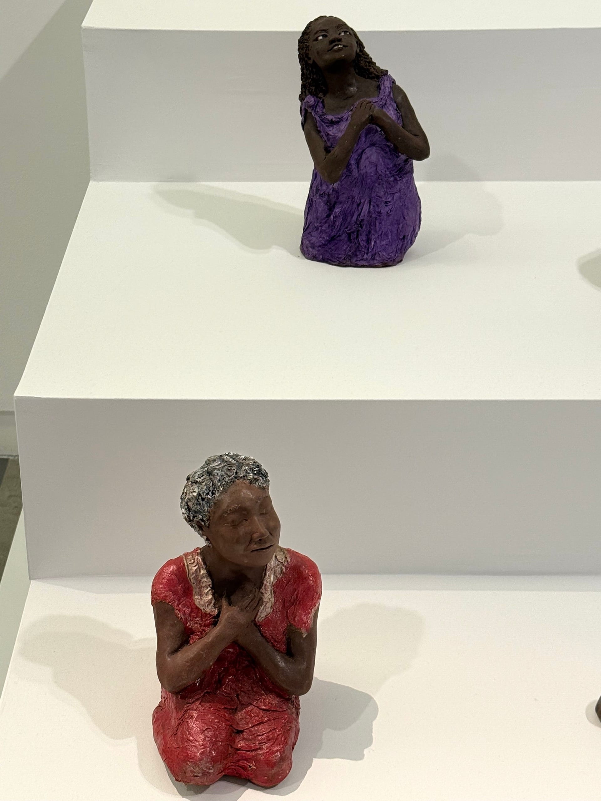 Sitting atop an altar, “Mothers Prayers” (1999) and “Glory (A Taste of Sweetness)” (2001) appear to be in silent conversation. On the lower step, an older, silver-haired woman wearing a red dress kneels in prayer with closed eyes. Above her, a young girl in a purple dress prays in a similar position, but her head faces skyward, her eyes open and her long dark hair cascading back. The placement of figures on different levels deepens a sense of intergenerational dialogue, linking their gestures of faith across space and time.