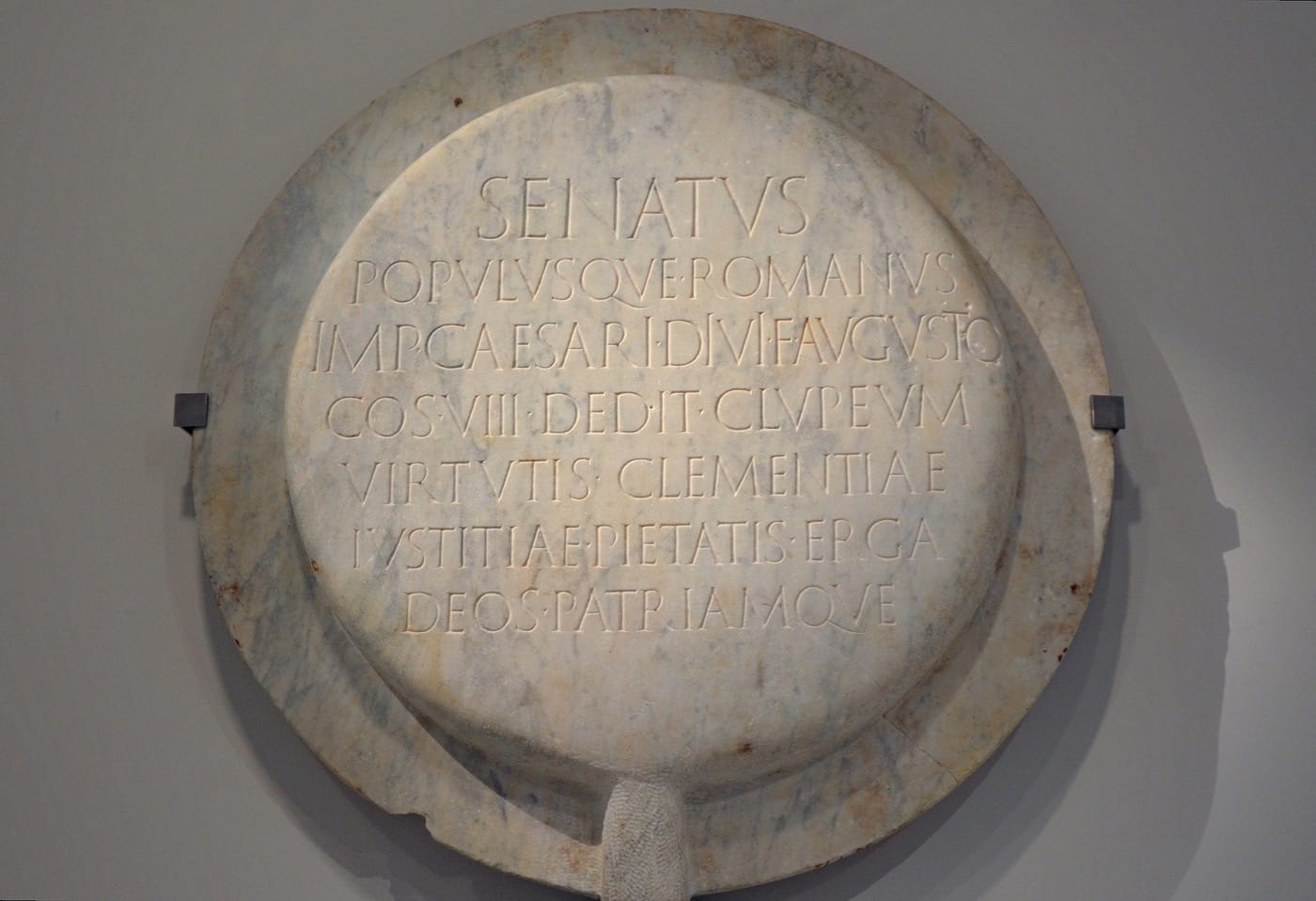 Augustus would use the full phrase within his Res Gestae Divi Augusti, an epic biographical inscription listing all of his deeds, which was sent out across the provinces in both Latin and Greek. On his coinage, he shortened the legitimizing phrase to just SPQR in order to preserve the myth that the Republic still lived on.