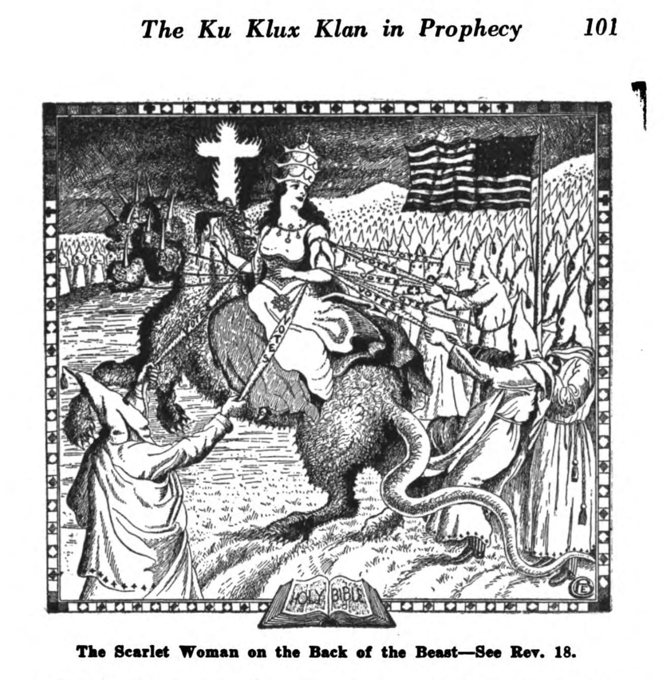 The Ku Klux Klan also capitalized on eschatological imagery and the fear surrounding the Apocalypse as one way of validating and legitimizing their violent campaigns against Jews, Catholics, and African Americans. In 1925, a White woman named Alma Bridwell White published a popular book called The Ku Klux Klan in Prophecy, which included illustrations of key apocalyptic episodes and created a direct link between the Klan, the prophecies of the Bible and the Book of Revelation, and American patriotism.