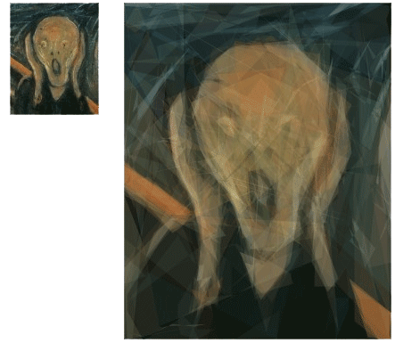 Alsing created a program that renders polygons in increasingly complex combinations, using code that mimics the mutation of DNA to shift the combinations ever so slightly in continuous iterations. The program then compares the iteration to an image of the Mona Lisa, and if it looks more like the painting than the last iteration, it moves on, and mutates again. Only the best mutations, as judged by their similarity to Leonardo’s canvas, survive.