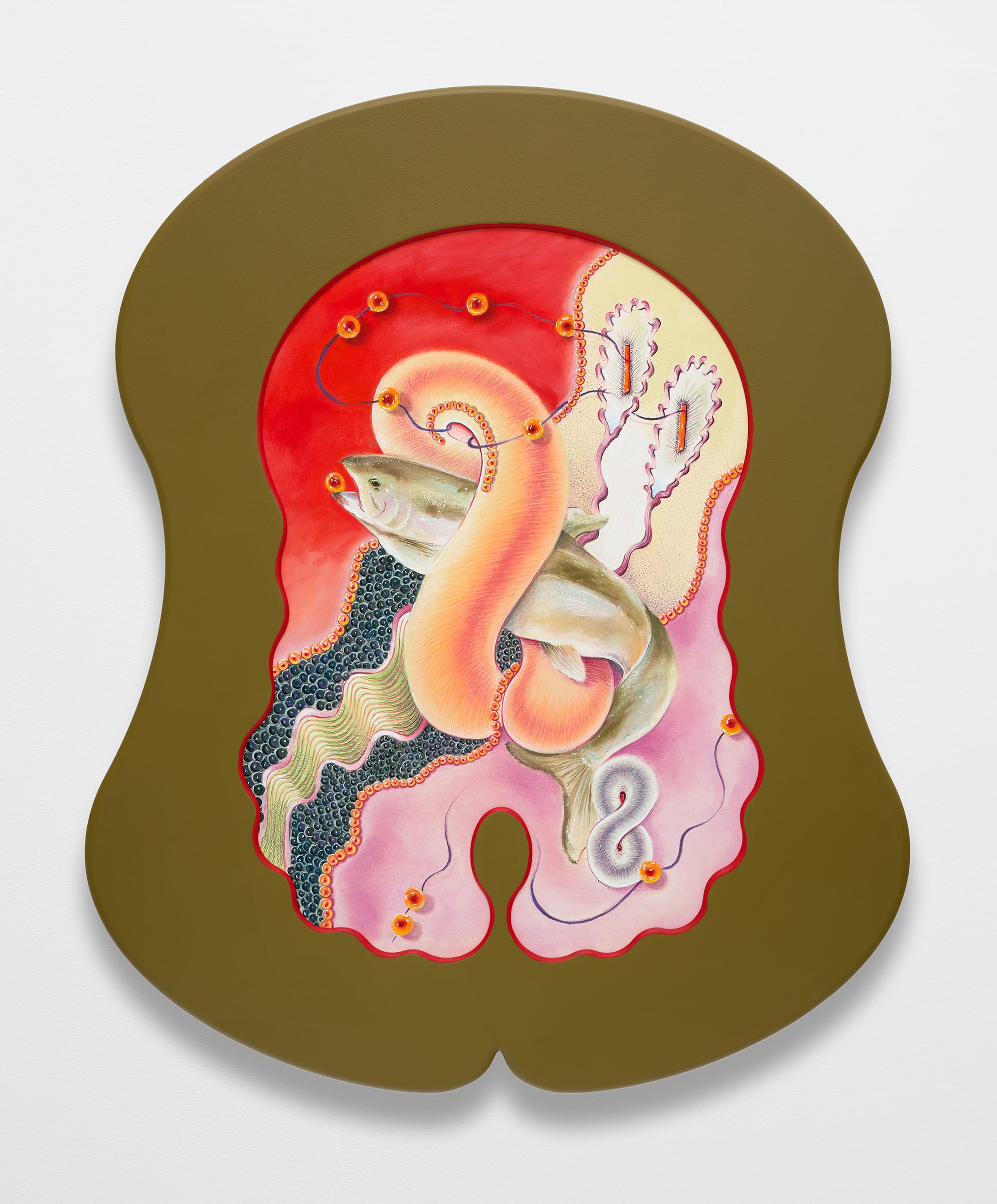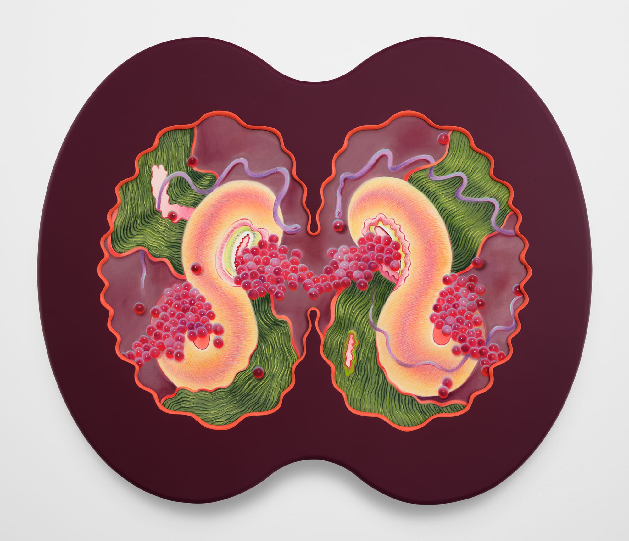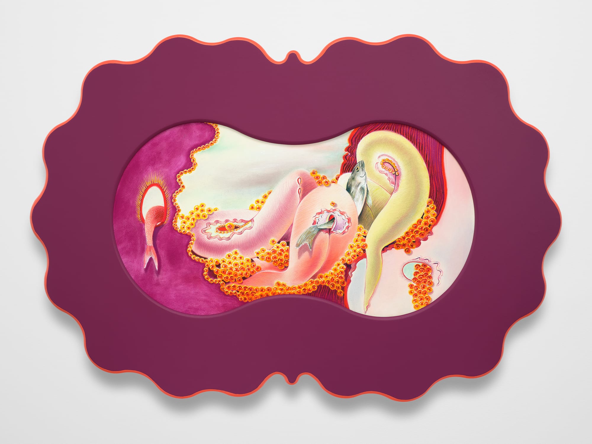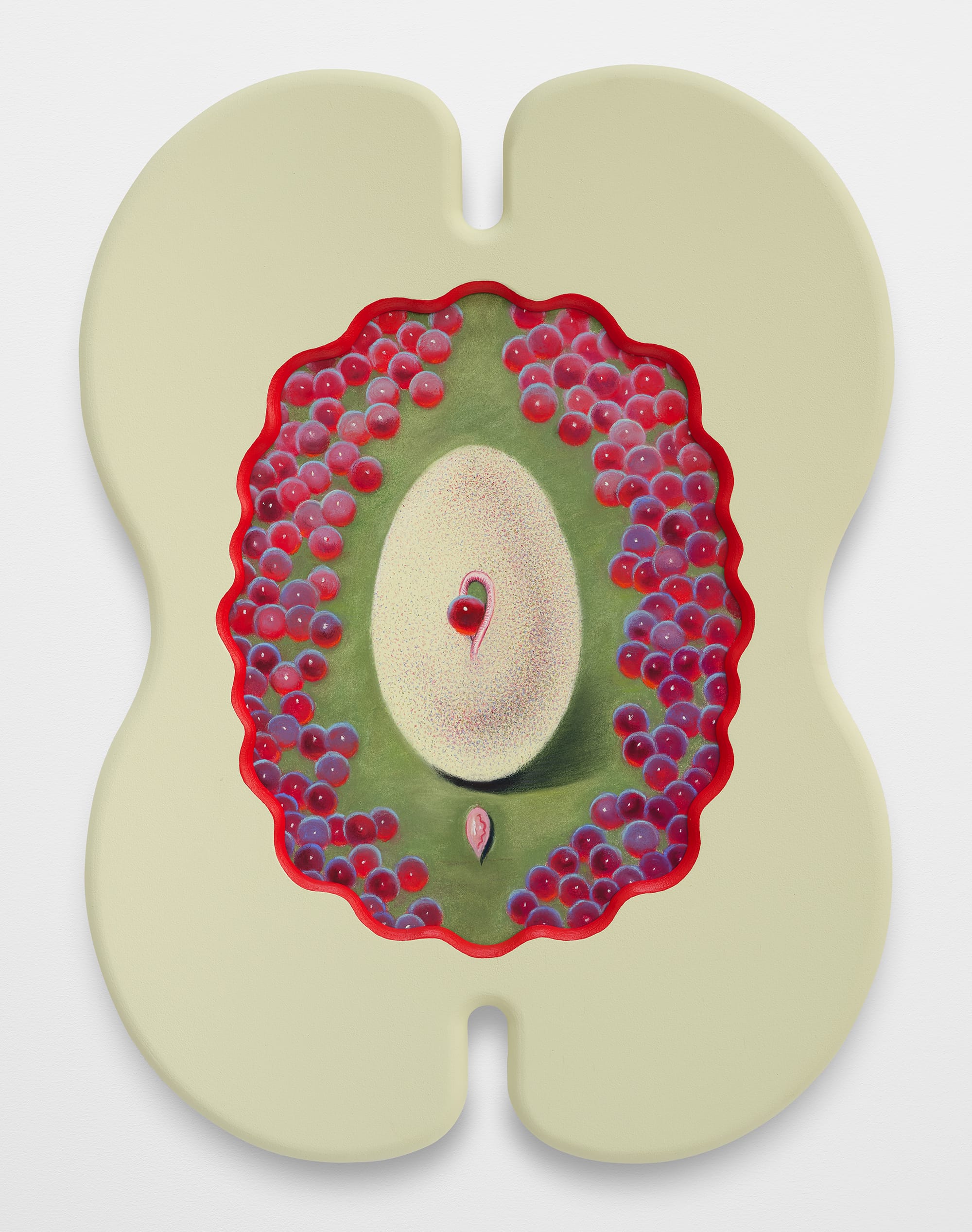 In “First Born” (2023), the artist takes on the moment of conception, illustrating the moment in which the single sperm reaches the egg and penetrates the outer membrane. Such explorations continue in works such as “Mother of Two” (2023), in which a bunch of grapes suggesting pubic hair is flanked on both sides by chicken eggs that stand in for ovaries. Her playful takes on female physiognomy extend beyond the picture plane itself into the organic shapes of the colorful, customized frames, which resemble MRI slices of the abdomen and pelvic region.