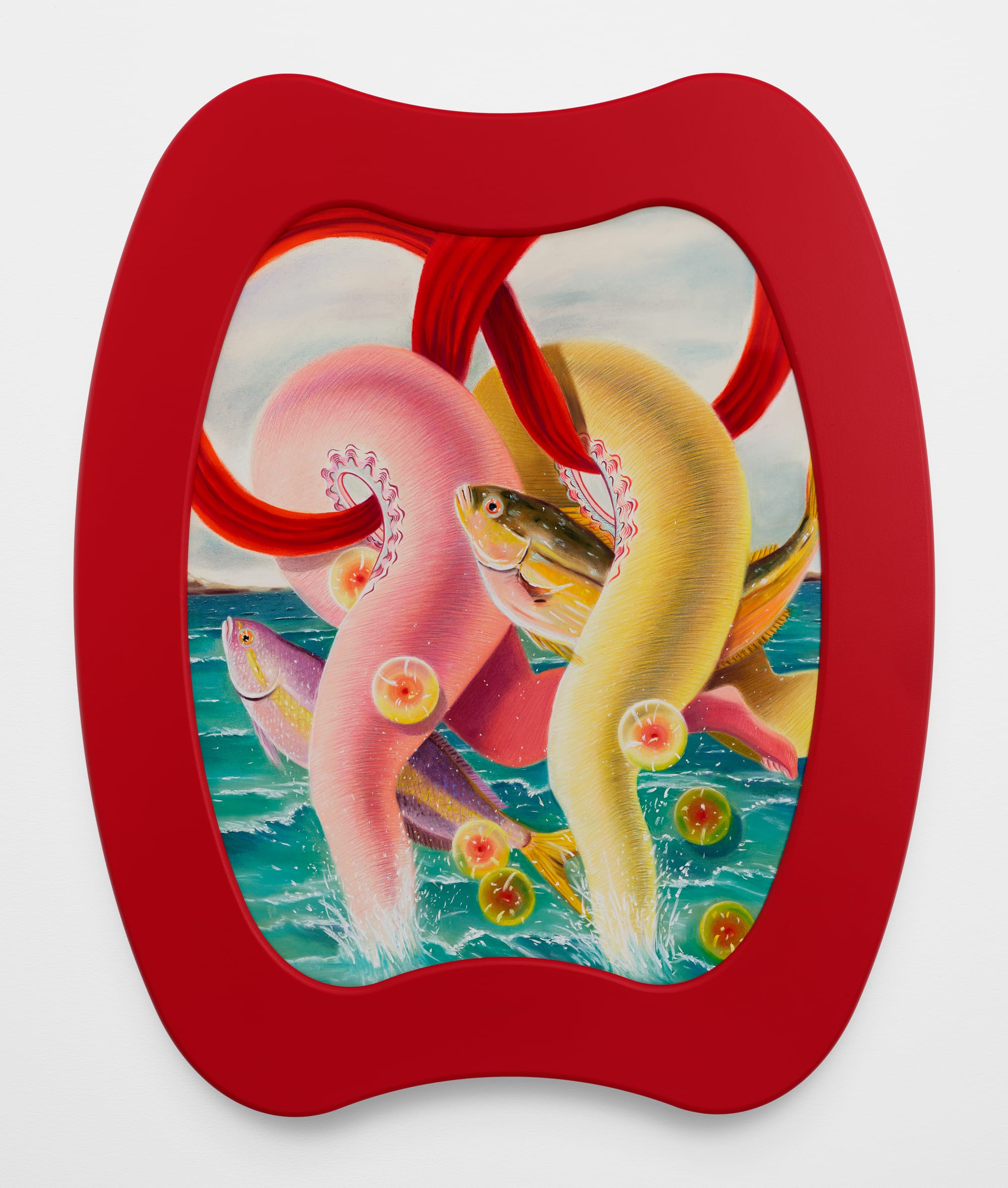 In “Sister Sister” (2024), twin maenads take the form of tentacle-like, disembodied legs that run, stomp, and splash through the surf. Fish jump and red fabric weaves between the creatures’ legs and through vulvar orifices whose appearance may be a nod to a “bearded clam,” a slang term for a vagina. Innuendos abound: I privately nicknamed “Wild Caught” (2023), in which strings of fish eggs suggestively rest in the crevice between a pair of legs, “Pearl Necklace.” As a whole, the work on view illustrates the life-giving forces of attraction, sex, and creation — but also hints at the darker half of those binaries in centering female monsters as their subjects, including repulsion, death, and destruction. To return to Freud for a moment, I’d suggest not penis-envy as a basis to misogyny but rather vagina-envy: male jealousy of a woman’s ability to both create and destroy life.