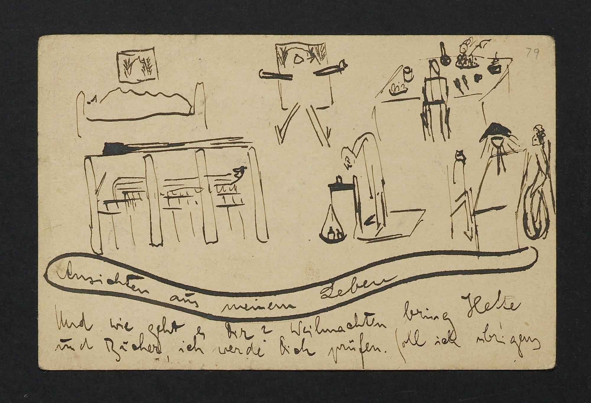 But we are given enough details to contextualize some of his writing and cobble together a partial image of Kafka. In a telling quote from 1902, for example, he describes his home of Prague as “a little mother” with “claws.” The comment speaks to the atmosphere of entrapment and claustrophobia that weighs down so many of his scenarios. He also had a good sense of humor, evidenced in the cheeky postcards he sent to his sister and brother-in-law. These are reminders of the humor laced throughout his stories.