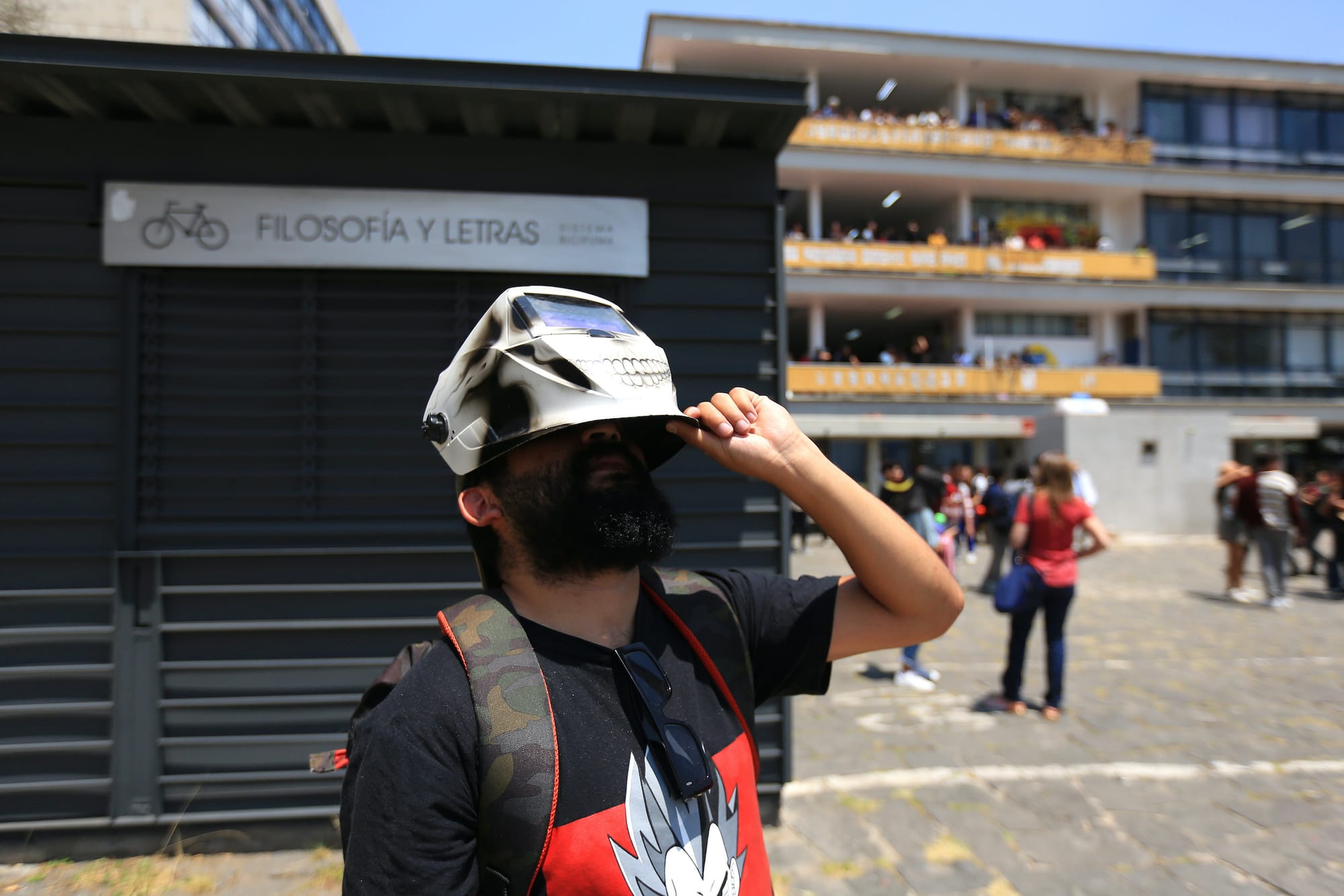 A man wears a special protective mask to watch the eclipse in Mexico City. (photo by Fernando de Dios/Getty Images)