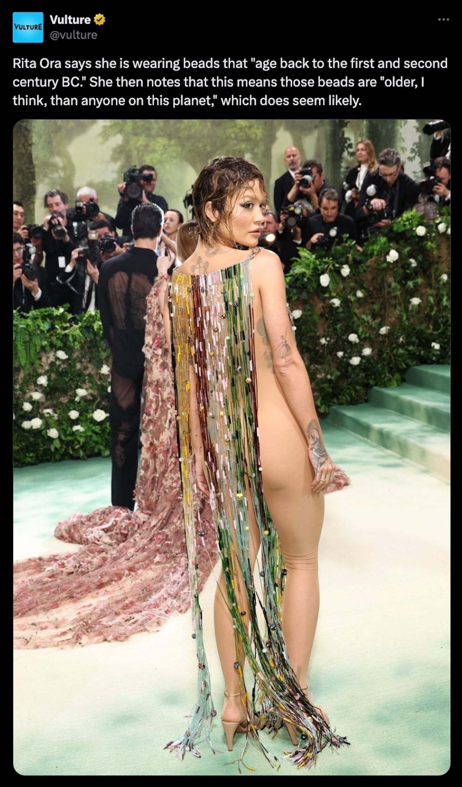 And what's a Met Gala without Rita Ora somehow still in attendance and saying something mind-numbingly stupid but in an iconic way? The look was giving door beads circa mid-2000s despite Ora's claims that the beads "age back to the first and second century BC ... older, I think, than anyone on this planet." But at least she paid attention to the "time" element of the dress code?