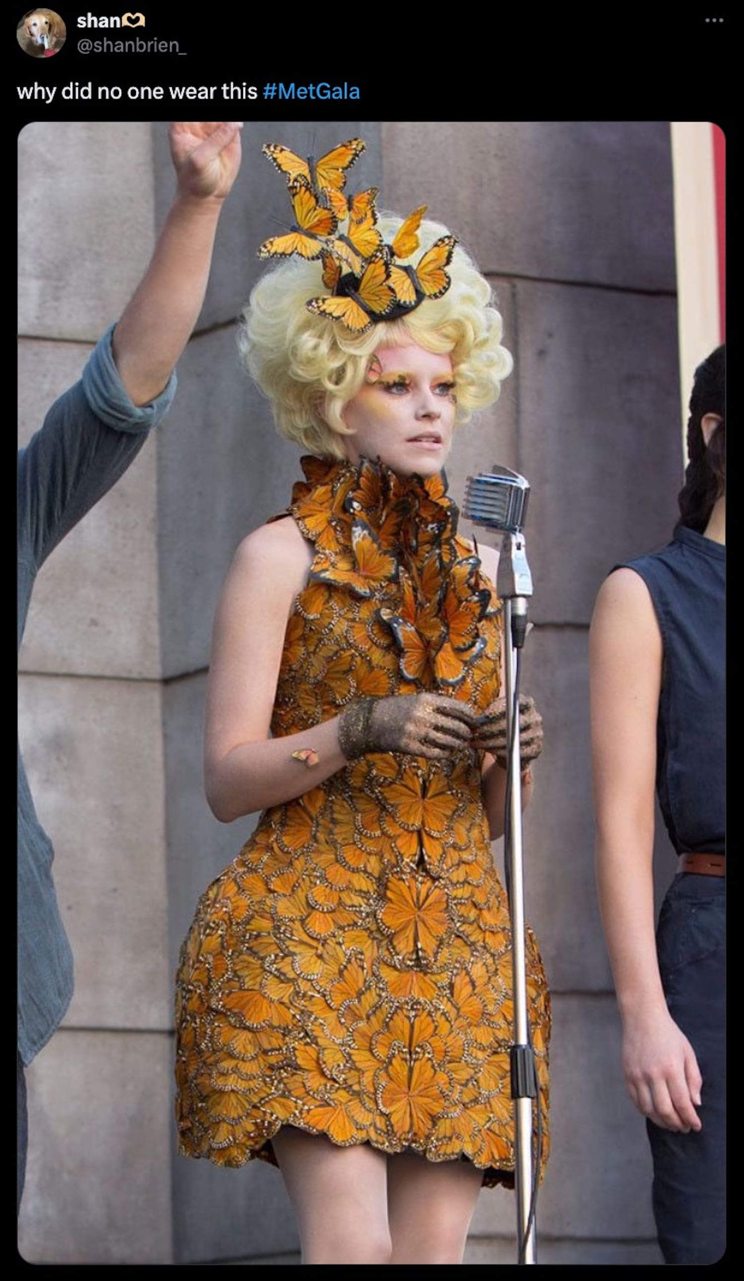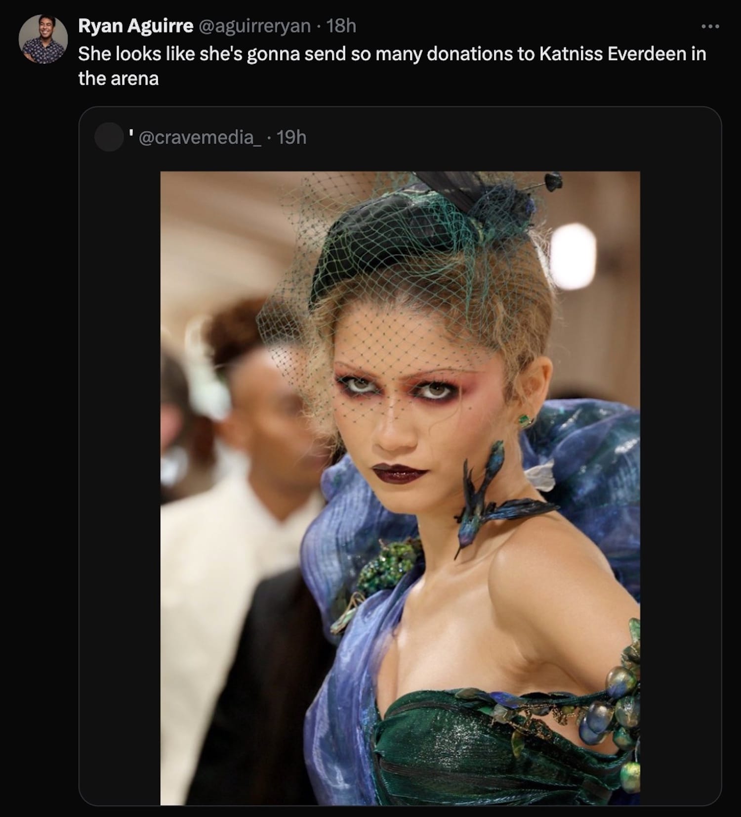 Online, many are comparing the Met Gala's display of wealth and opulence with the Hunger Games saga, in which the lavishly dressed residents of the Capitol enjoy the annual sport of watching representatives from its colonies ("districts," in the series's parlance) fight each other to the death. In keeping with tradition, we've scoured the post-gala feeds and rounded up the most noteworthy memes for you, from eerie dystopian parallels to an art history throwback.