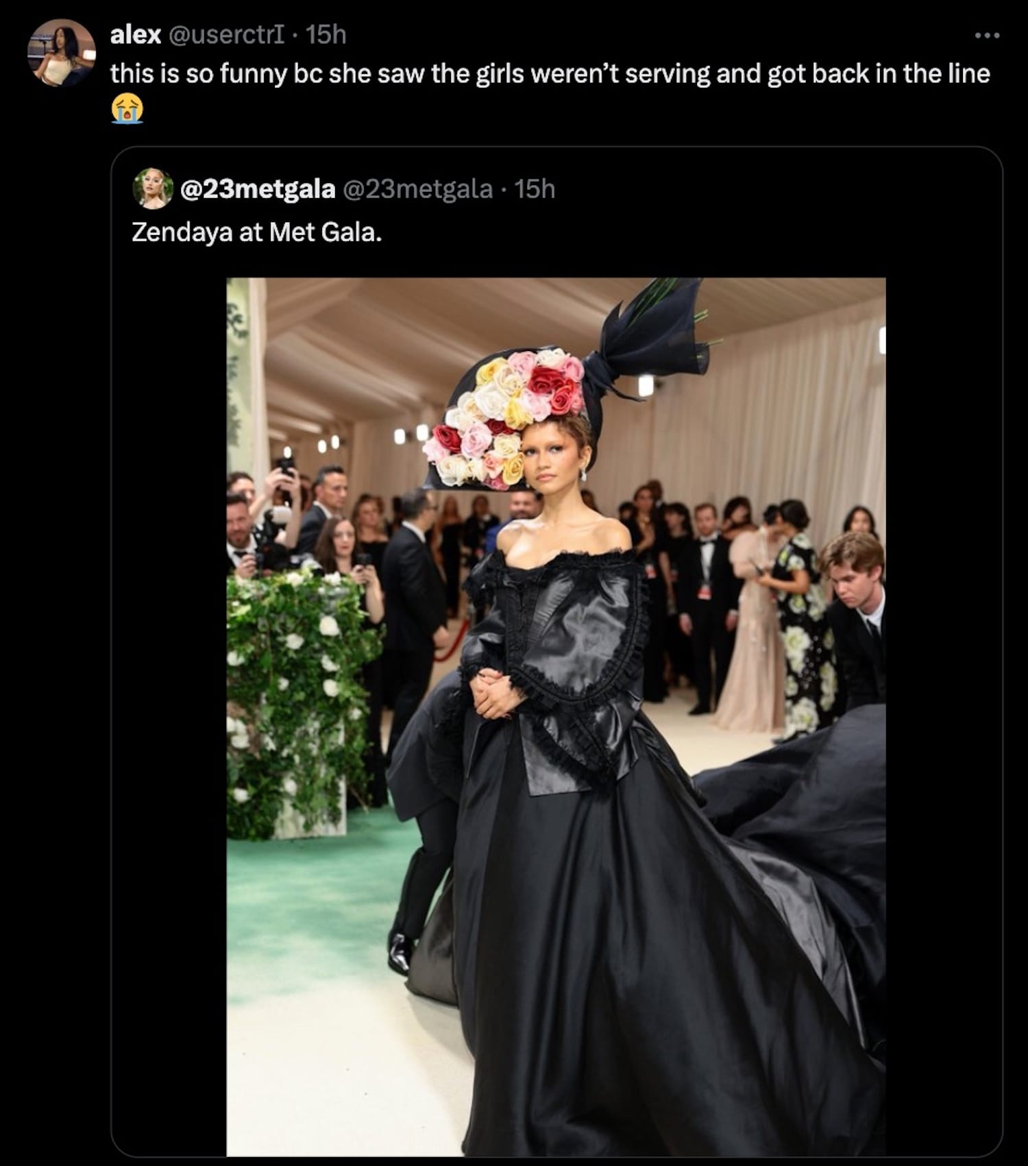 And speaking of serving ... Only few brought Hunger Games's Effie Trinket-levels of ~cuntitude~ to the Met Gala this year. I mean flower after flower after flower, and you're telling me nobody could think of the bees and butterflies? The planet really is doomed at this rate. (Before anyone says it, I know that Mona Patel wore an Iris van Herpen dress with moving butterfly wing-elements on it, okay!)