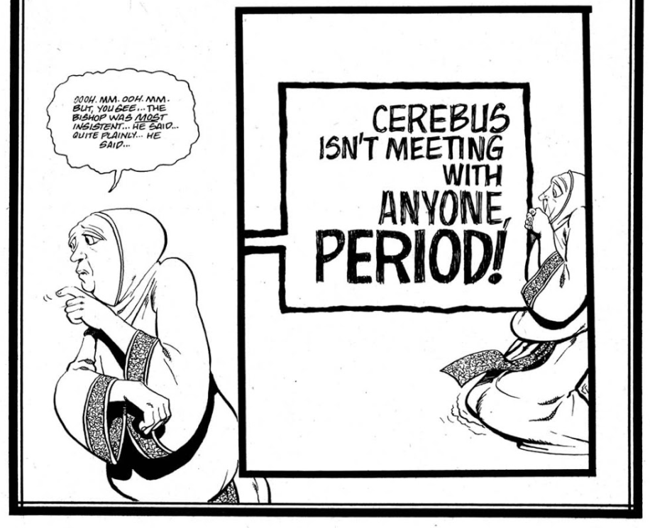 That story sees Cerebus, originally a hard-drinking, hard-brawling, vagrant barbarian, embarking on a journey which takes him through all the spheres of political and religious power within his fantasy world, and then onward into higher realms of consciousness and reality. Outside forces manipulate events to make Cerebus the prime minister of a country, and then later a pope — both times, his own venality and disinterest in anyone beside himself cause him to fall from power. He twice undergoes a spiritual ascension during which he meets an omniscient higher being. He makes enemies of the Cirinists, a group of matriarchal fanatics. He eventually attempts to settle down with the object of his romantic obsession, the human dancer Jaka, only to ultimately reject her. He eventually obtains the conquest he’s long desired, but can glean no pleasure from it. Cerebus is a longform study in dissatisfaction born from spiritual emptiness.
