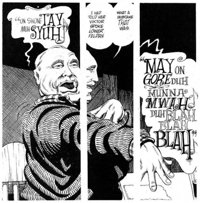 Gerhard taking over the backgrounds allowed Sim to continue to play with the medium, especially with panel layouts and lettering. There is perhaps no one who can match him in conveying the way a character moves through a few well-chosen “shots,” or in going beyond the standard grammar of how readers expect comic books to work. In particular, Sim incorporates “sound” unlike any other comic artist, using sound effects not merely to describe scenes but to illustrate motion, both on a panel and off it, and to unify a character’s action and mood. He also loves to work around traditional notions of dialogue delivery. For example, he’ll use one or a few panels and an accompanying script on a sidebar to depict a long conversation which might otherwise consume multiple pages.