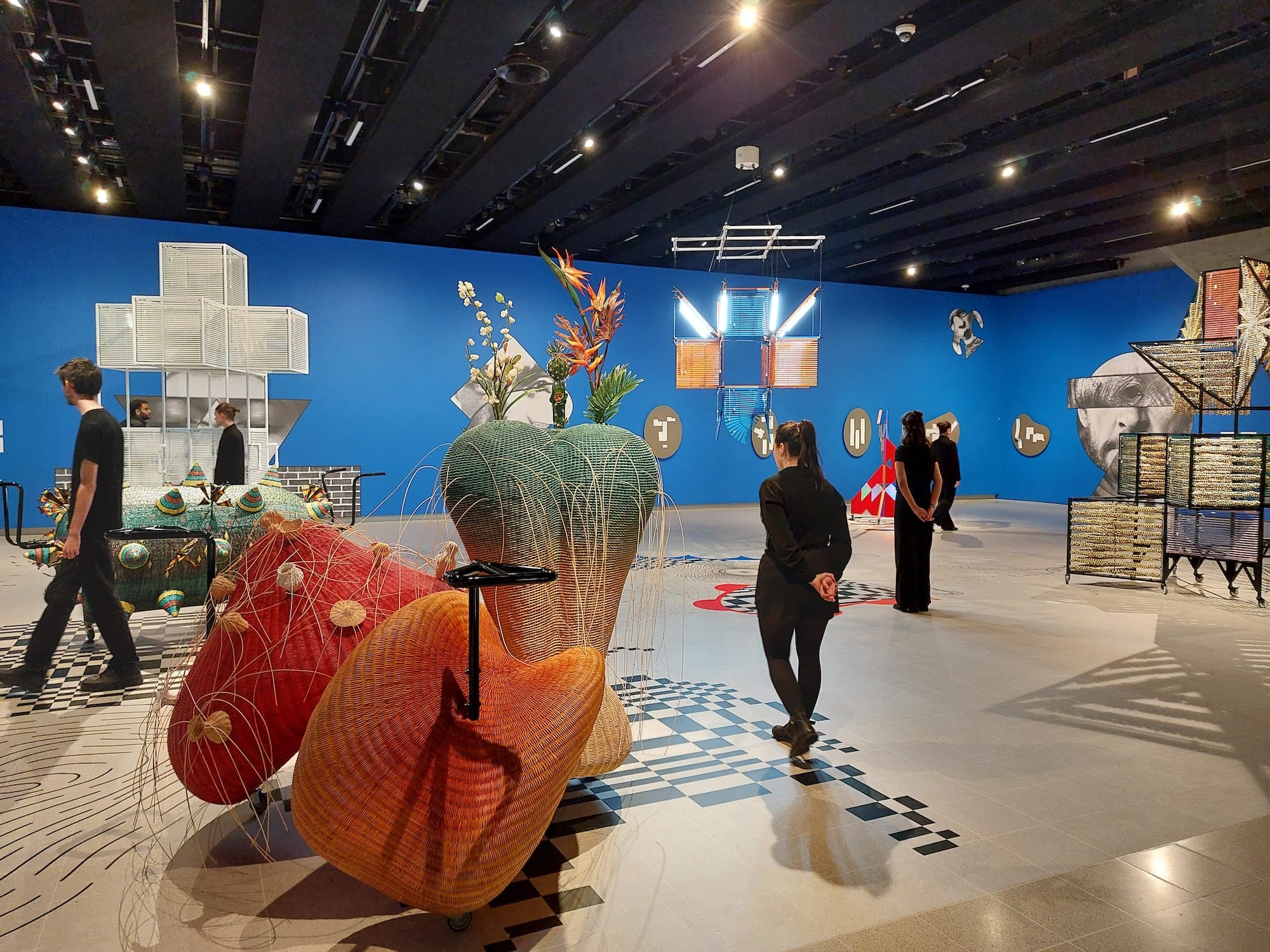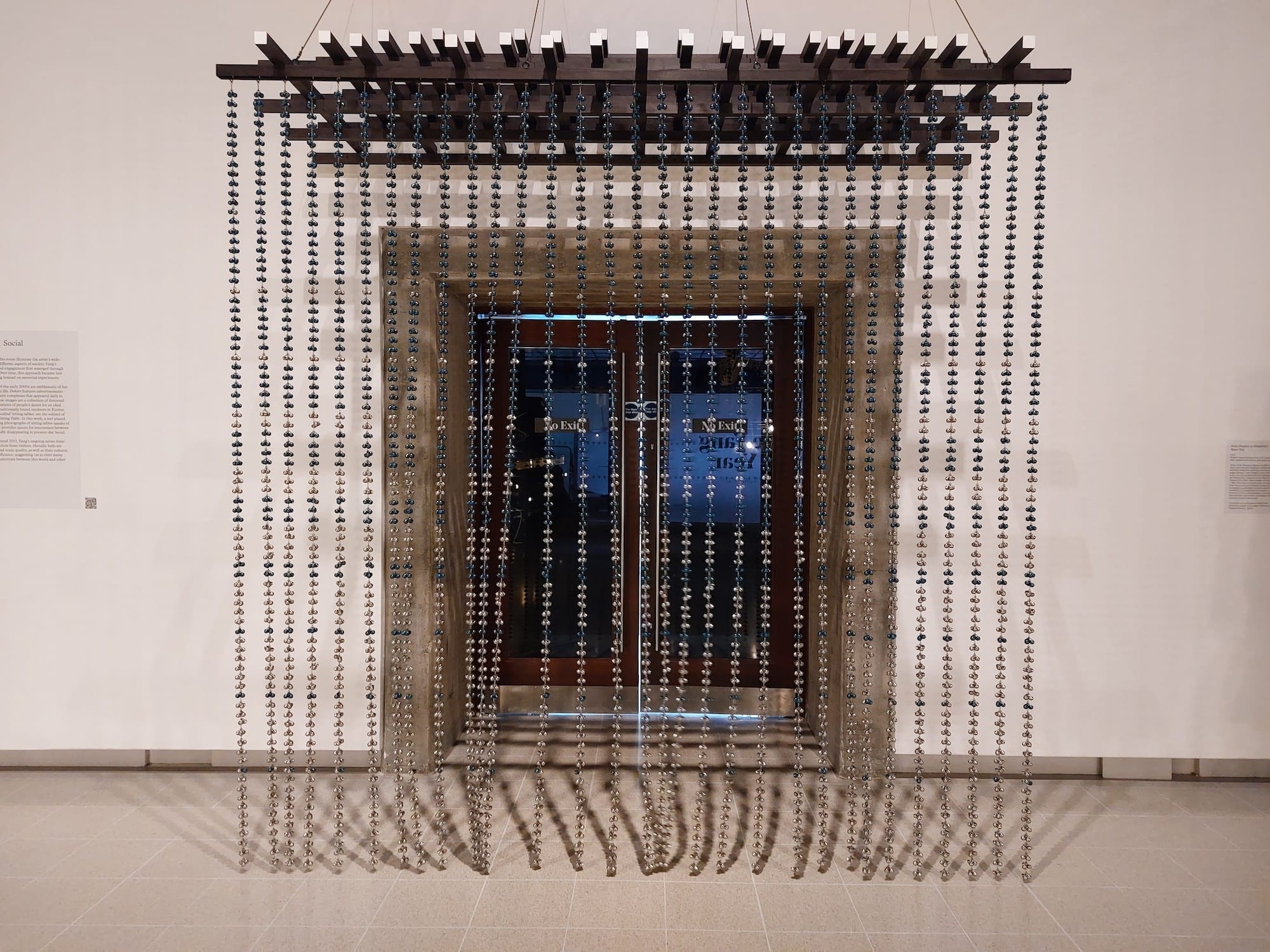 Once a week, without prior announcement, a troupe of black-clad performers walk silently up to the sculptures in this section and begin to activate them, apparently following the esoteric mapping on the floor. The pieces, which are fitted with functional metal handles, move smoothly on their castors in the quiet of the gallery space, highlighting the small sounds of the works themselves: the creak of rattan, the clinking of the pull cords on venetian blinds, and the surprisingly subtle tinkling of thousands of tiny metal bells. There is a satisfying sense of unexplained ritual in the sculptures fulfilling their latent potential.