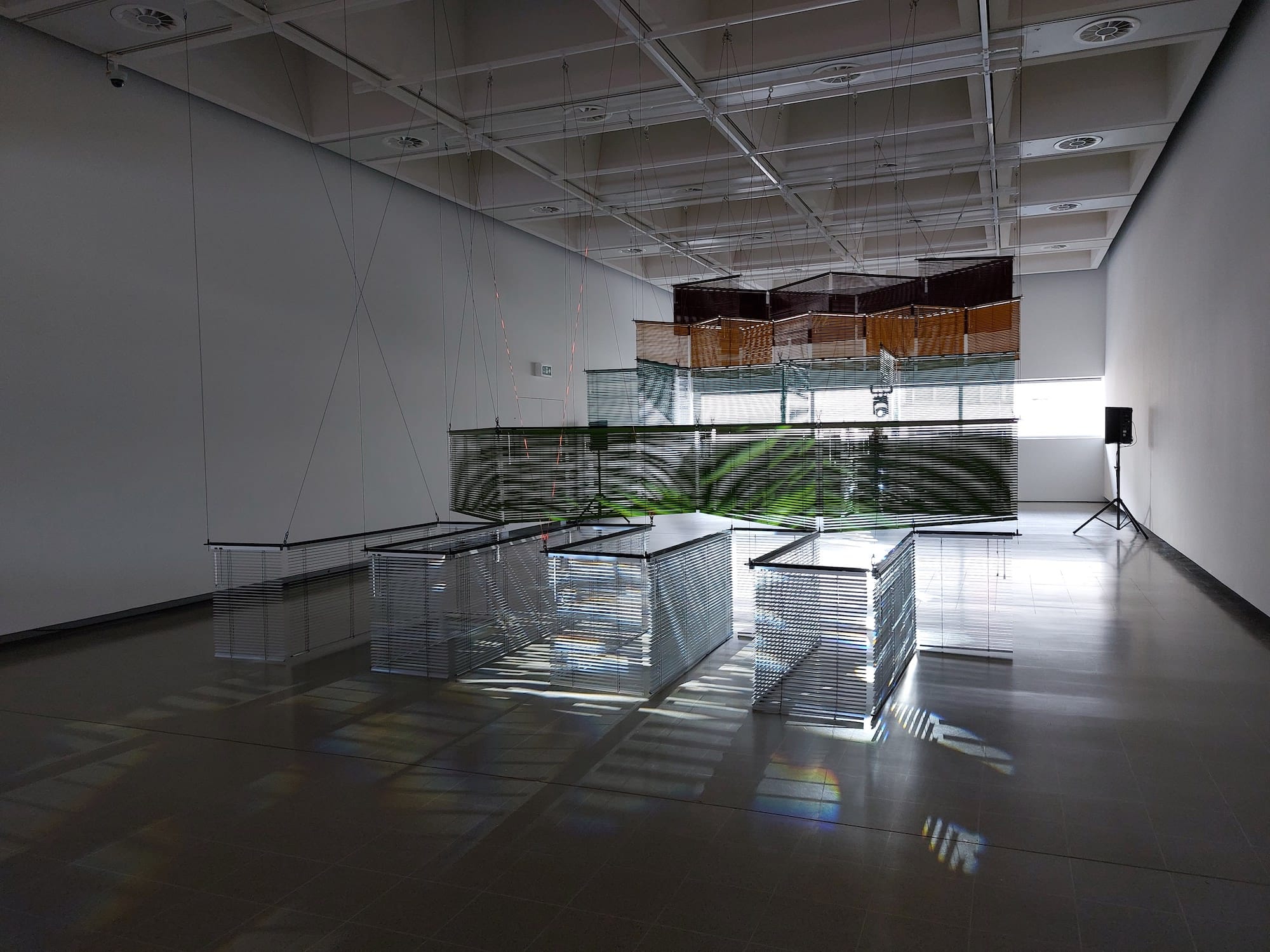 After the organic and folkloric tone of these galleries, the displays in the final rooms, which primarily focus on Yang’s sculptures of venetian blinds, employ a notably more technological aesthetic. Works such as “Series of Vulnerable Arrangements – Version Utrecht” (2006), for instance, utilize heat lamps, fans, and scent atomizers to literally change the atmosphere of the gallery space, inviting viewers to consider the factors that affect how art is produced, displayed, and experienced. Across her practice as a whole, Yang is drawn to how such materials simultaneously conceal and reveal their surroundings, employing them both as tools for dividing the exhibition space and as sculptural objects in their own right.