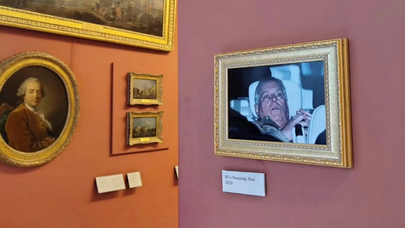 - Activists install a photo of former Prince Andrew Mountbatten-Windsor, taken after his recent arrest, at the Louvre museum in Paris. The photo is titled, "He’s Sweating Now.”
