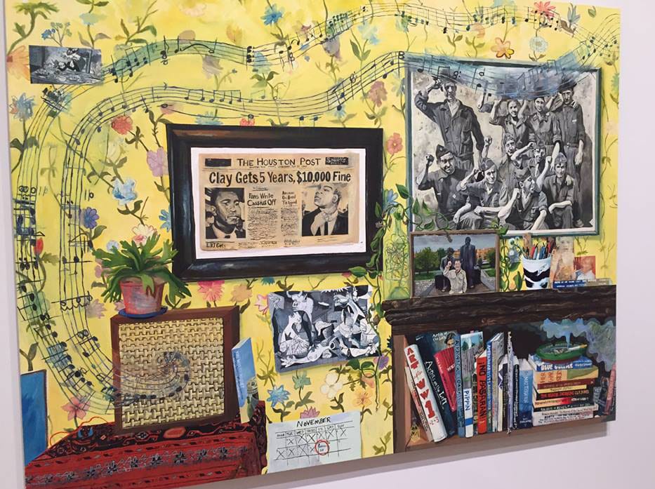 Meanwhile, Dupuy-Spencer probes the present more explicitly. While many visitors seem to gravitate toward her depiction of a Trump rally, I was mesmerized by her pencil drawing titled “Matriarchs of the Hudson Valley (1980s-90s)” (2016), which looks like an update of a Sylvia Sleigh painting. Here, Dupuy-Spencer glorifies a homey, soft world of women, a sharp contrast to the masculine domain of the nearby and much larger oil painting “Veteran’s Day” (2016). In the latter, she interrupts the femme associations of the flowered yellow wallpaper by showcasing a framed photograph of soldiers in salute, as well as a framed newspaper clipping from which Cassius Clay peers out — with volumes by Lorca, Lorde, and Sontag pictured on the bookshelf, for further contrast.