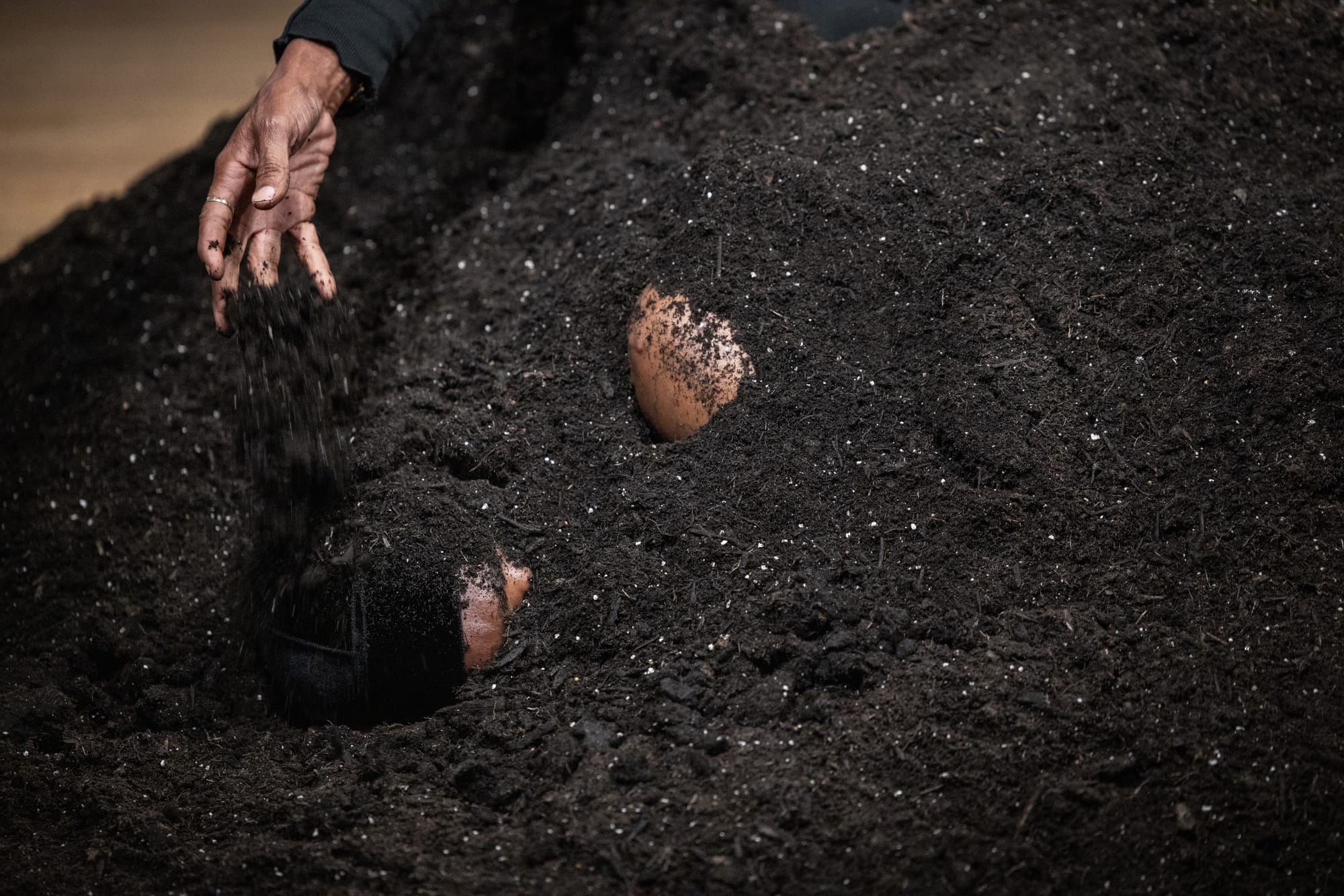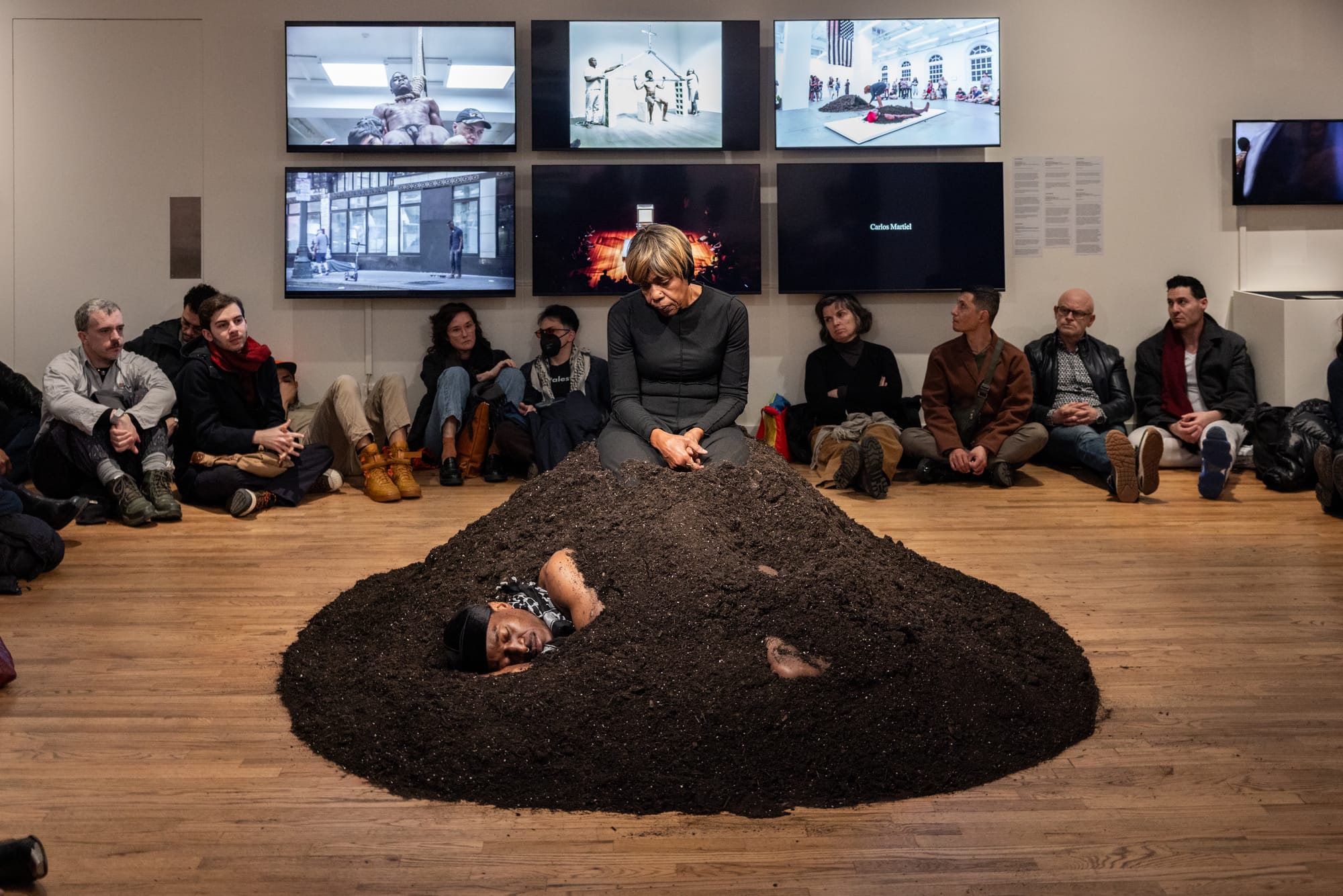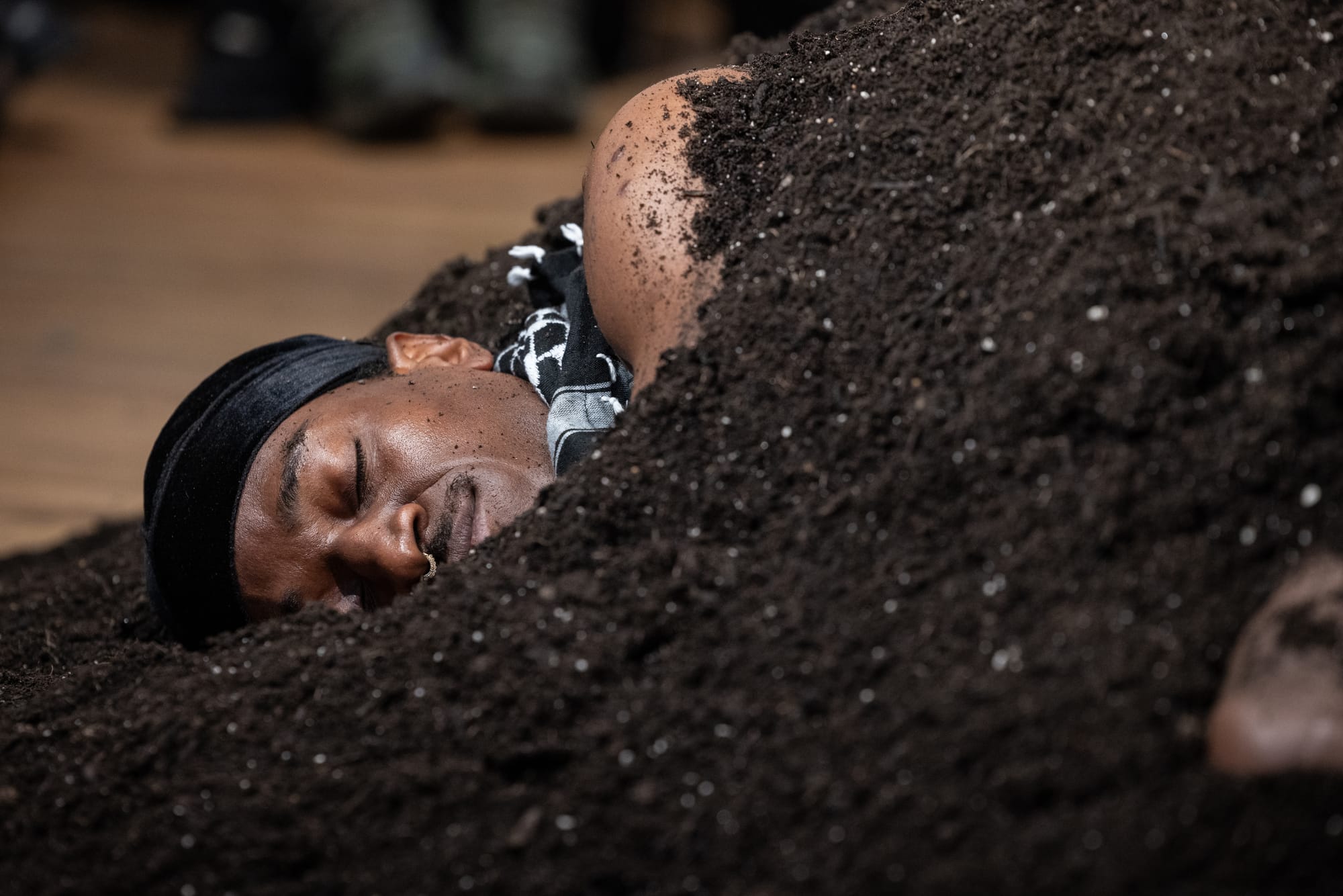Sneed reads on a double bill with a performance by Martiel in which the latter is covered almost entirely in a mound of earth, just edges of a face exposed, at the center of the small gallery. The artist’s mother sits atop the mound, motionless, gazing at her son, in an image that distills not only the decades they’ve spent together but centuries of Black maternal grief at the premature death of sons and daughters at the hands of both state and extralegal violence. The audience continues to file in until the room is full of breath, and waits and fidgets. Nothing happens until, after a duration that cannot be measured by a clock, the body gets up and leaves. He is naked except for a black and white keffiyeh around his neck. His mother follows.