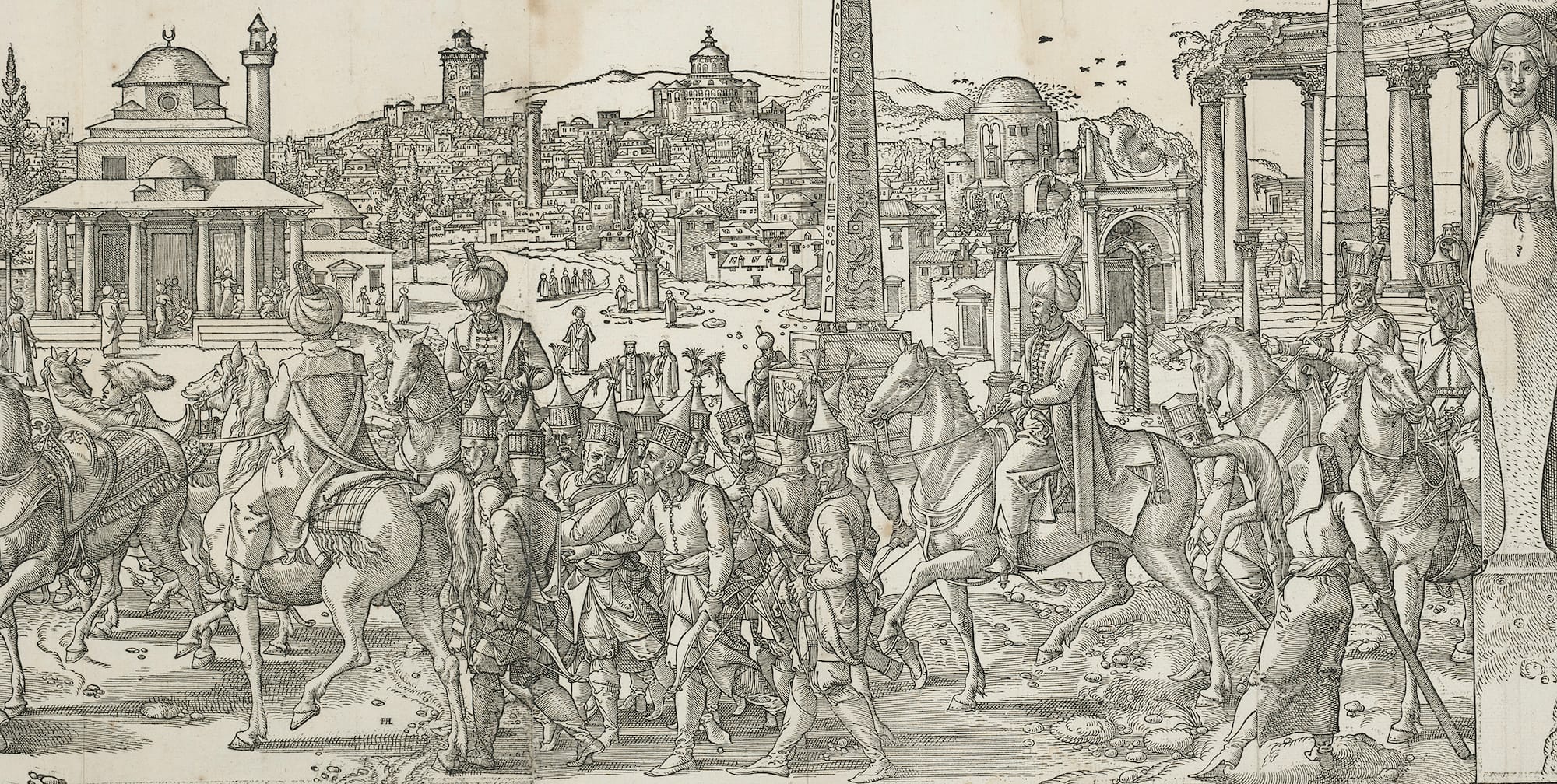 This odyssey is made visual in the monumental, 16-foot woodcut “Customs and Fashions of the Turks” (1553) by Pieter Coecke van Aelst, an artist whose one-person show at the Metropolitan Museum of Art in 2014 caused a minor sensation with its grand tapestries and small-scale paper art. We follow Coecke from Antwerp to Istanbul in 1533 in richly detailed scenes, from treacherous mountains to the Roman, Egyptian, and Muslim monuments of the city where Sultan Süleyman, called “the Lawgiver” and “the Magnificent,” presides. Traversing Slavonia and Macedonia (present-day Croatia and northern Greece) to Istanbul, Coecke camps with soldiers in the mountains, picnics with other travelers, and watches funeral processions and circumcision ceremonies.