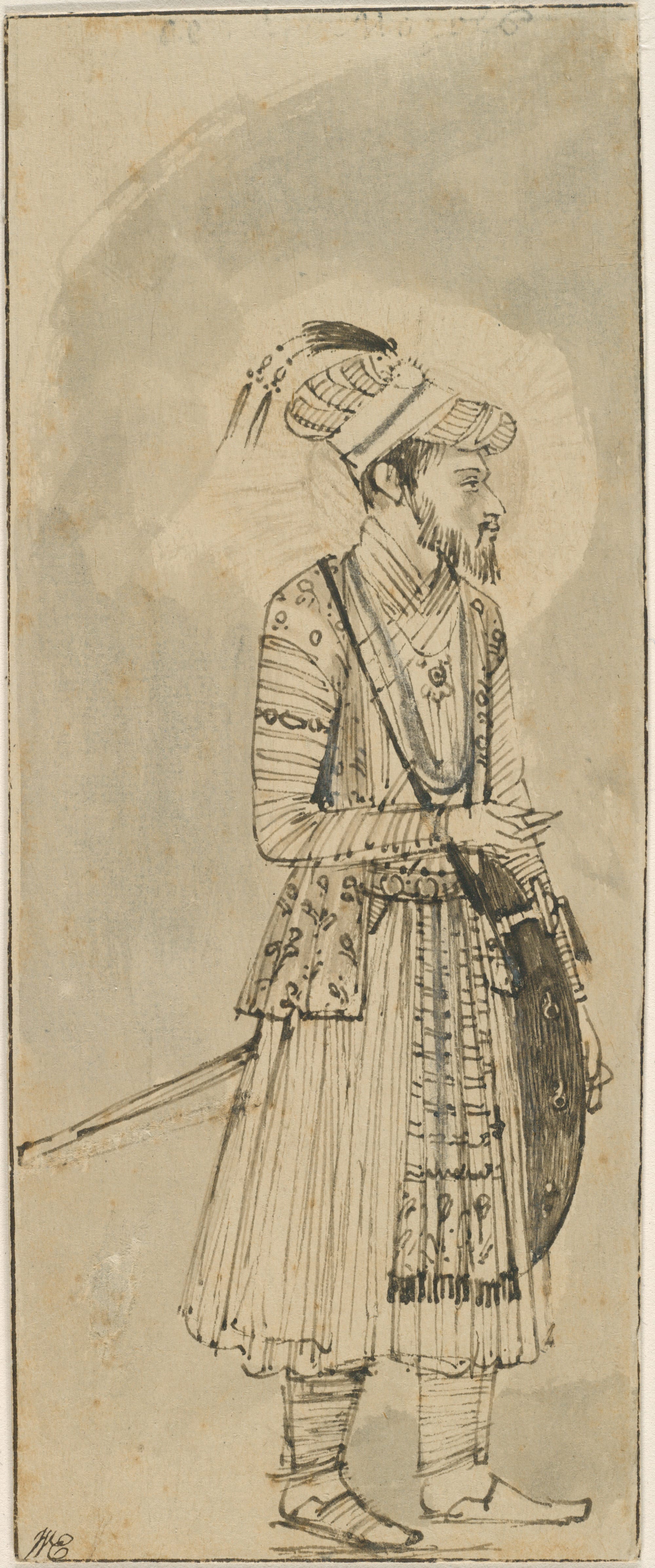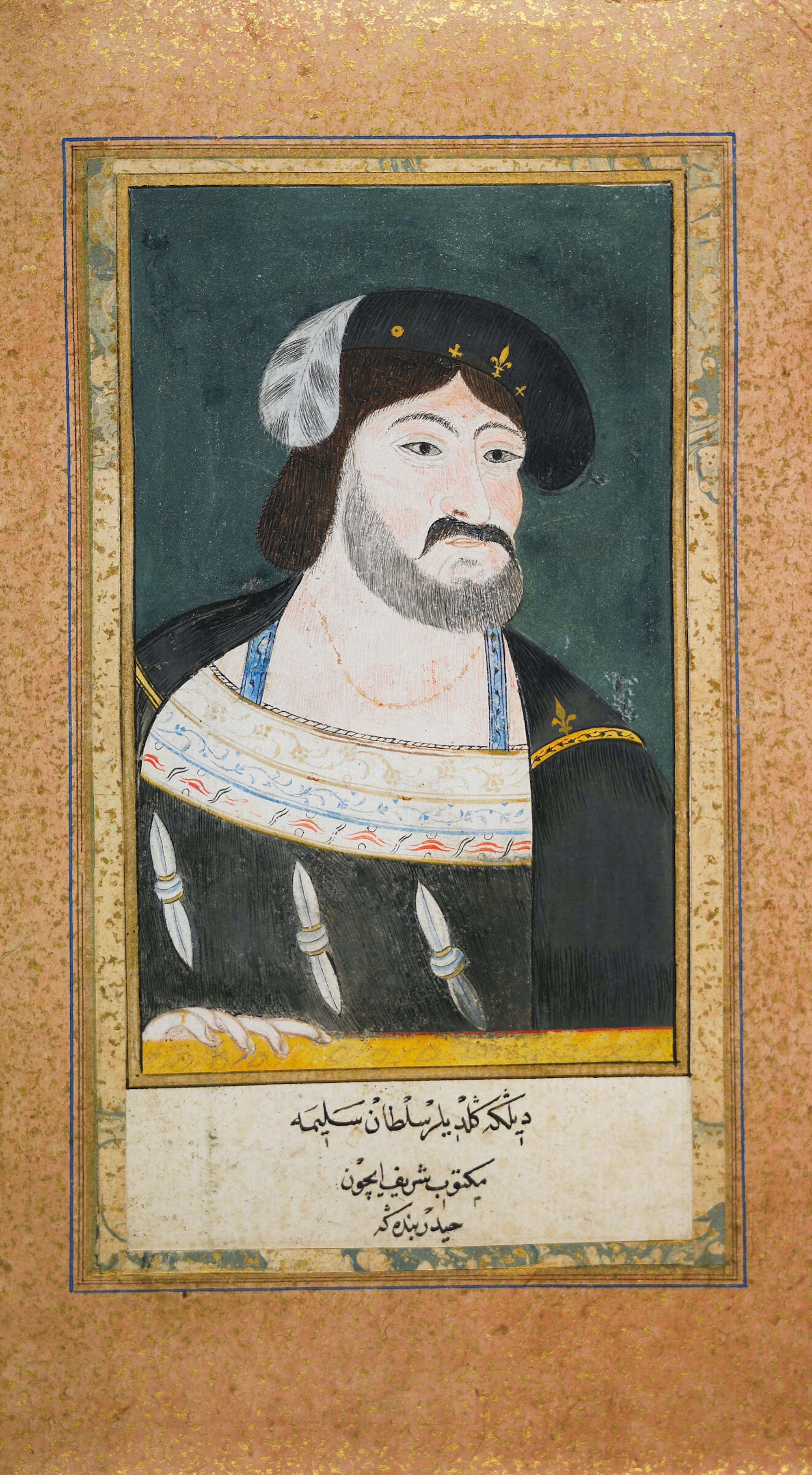 Europeans recorded the visiting dignitaries from abroad, as in Aegidius Sadeler's engravings of the Safavid ambassadors to the Prague court, and Ottoman artists' portrayal of European rulers, usually based on intermediate portraits. The Turkish naval captain and poet Haydar Reis made watercolor portraits of rulers and famous men such as Italian physician and historian Paolo Giovio. In “Francis I, King of France” (1566–74), after a c. 1530 work by painter Jean Clouet, he translated the black beret and white plume of his source into a trim hat with floppy feather; he discarded Clouet's suspiciously smiling eyes, and mouth for a distant gaze and pursed lips beneath a crooked mustache and enlarged the neck to a massive size. While retaining the recognizable traits of his model, Reis transformed the textured volumes of Francis's clothing into forceful flat areas of color with delicate trim.