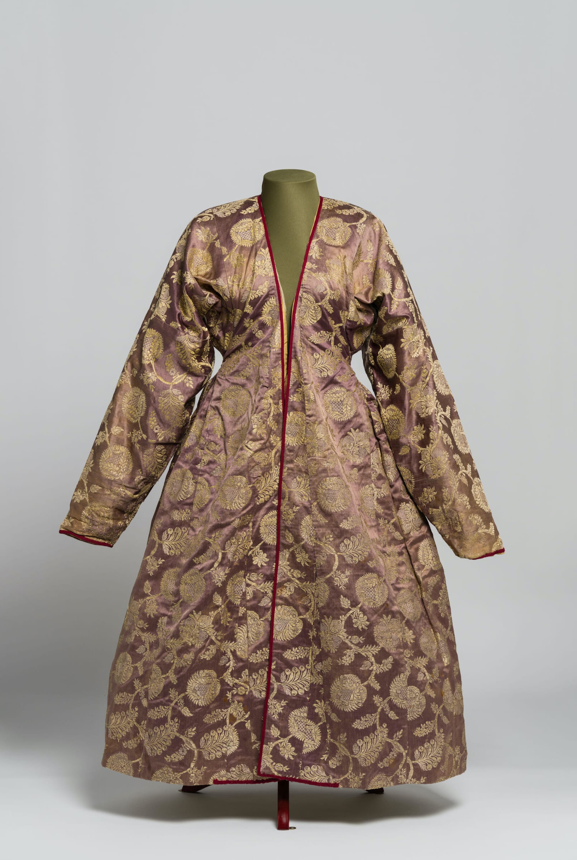 Visitors are invited to imagine the diminutive woman lucky enough to wear a sumptuous silk velvet robe with silver and gold-threaded floral designs. Never before exhibited, its metallic threads glow. Less inviting are the bridal shoes of wood, shell, leather, and glass with precariously high platforms; these kept feet dry on a wet floor in a bath and made the bride taller, but required two attendants to keep her upright.