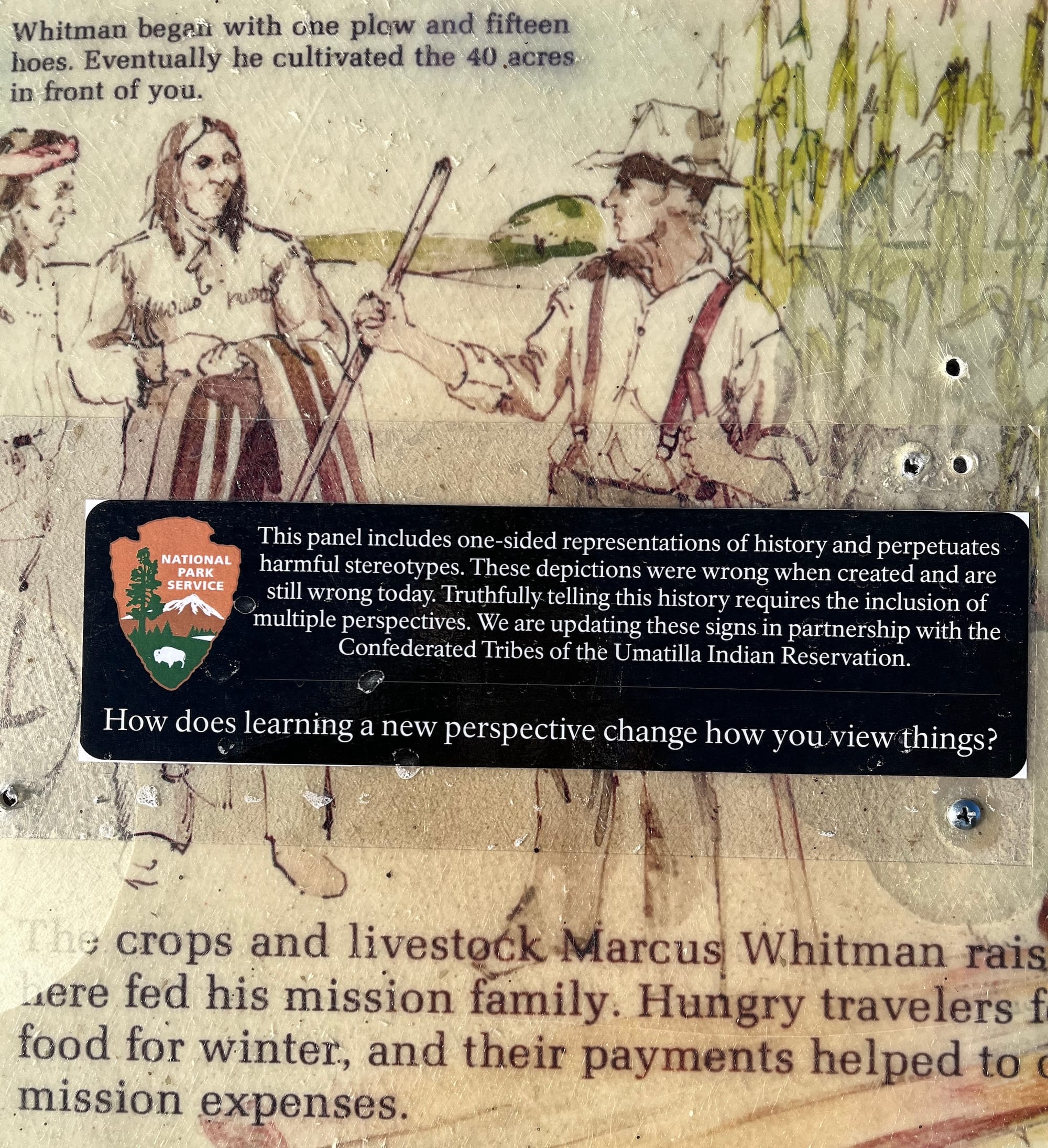 While I don't have the space to get into the full significance of the Whitman Mission and how the US government used what happened there to further justify the genocide of Indigenous people within the territories it sought to control, it represents one of many sites within the NPS system where the story is being reframed at this very moment. As you can see in the photo below, a terse but heavily freighted addendum was crudely affixed to every sign I passed. That small marker not only alludes to contemporary conversations about providing a more complete accounting of history, but also evokes the hundreds of years of history that preceded its creation, including the continued presence on that land of the very peoples the US government attempted to exterminate and their growing influence on the narratives constructed by those who tried to colonize them. It was a tiny moment of witnessing the slow but tectonic shifts in national storytelling that, as the CLUI exhibit reveals, are diligently being produced in the approved typography and layouts by a little-known team of government workers toiling away in their Harpers Ferry offices.