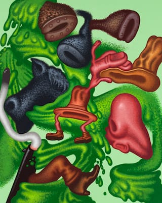 It is one thing to be an iconoclast and quite another to continue to be wildly inventive while relentless need drives you to poke fun at everything society might cherish and hold dear. Other artists — many of them influenced by Saul — have tried to be indecorous, but few are able to arrive at the exquisite synthesis of the comical and repugnant that he routinely achieves, seemingly without effort. I think the reason that Saul is so good at what he does goes beyond his mastery as a painter. It is one thing to make fun of your characters because you believe that you are superior to them, and quite another to feel empathetic to their hopeless condition. This is what Saul does so well. He reminds us that we are no better than the vaudeville clowns reacting frantically while the world is crashing down around them. Hysteria isn’t as foreign to us as we think. We might as well laugh at ourselves now, because the next time we might be too panicked to do so.
