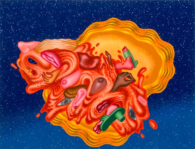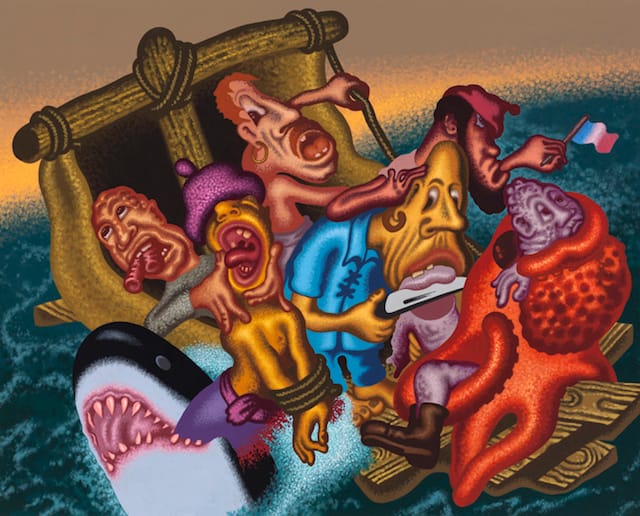 The one addition Saul has made is an orange-red, rubbery octopus wrapping its tentacles around a hapless survivor with lavender-colored skin. In another context, you might think this an example of interspecies sex, one inhuman and the other hapless. Nearby, a man is waving a tiny French flag — an act of pure, forlorn hopelessness — while stroking another man’s pointy, hairless head. The tenderness seems bizarre and pathetic rather than noble and uplifting. This is what makes Saul so good — for all the garish colors and peculiar deformations his characters have been subjected to, he is attentive to all the details. Nothing is glided over, nothing goes unconsidered, down to the shape and size of the shark’s teeth, which suggest Saul has paid a lot more attention to an actual shark’s teeth than one might suspect.