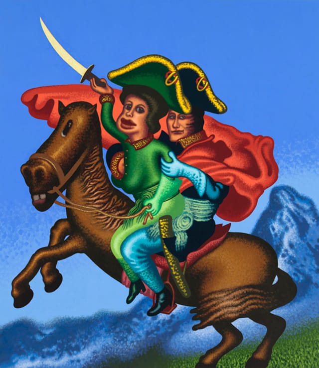 In “Two Napoleons Crossing the Alps” (2015), Josephine and Napoleon are making their escape on horseback. She is holding a sword aloft, while Napoleon — in a parody of his well-known pose — slips his hand into her blouse to cop a feel. The heroic becomes domestic, which is its opposite. Saul seems especially motivated to make exaggerated pastiches of well-known, academic paintings that celebrate heroes and heroism. His spoofs call to mind an unlikely association, Pablo Picasso’s many parodies of Edouard Manet’s “The Luncheon on the Grass” (1862) and Diego Velázquez’s “Las Meninas” (1656). While it might seem farfetched to compare Saul to Picasso, I think that their many parodies, burlesques and caricatures share something. For one thing, both artists are mocking themselves as much as they are caricaturing the work of others. In doing so, they admit to all sorts of feelings, from praise to envy to love. This is what I think is underlying the volcano stirring inside Saul. As much as they mock decorum and pretense, the self-serving and the heroic, his paintings are also wonderfully buffoonish expressions of unrequited love for the artists and art that preceded him, from the flawless bodies of Cabanel (who was Manet’s teacher) to the groveling adulation of Rigaud. Saul’s gift for bringing such deeply contradictory feelings into play, all while remaining attentive to the formal demands of his ludicrous vision of necessary distortion, places him in a class that is his alone. He is the great humorist of our troubled, troubling epoch.