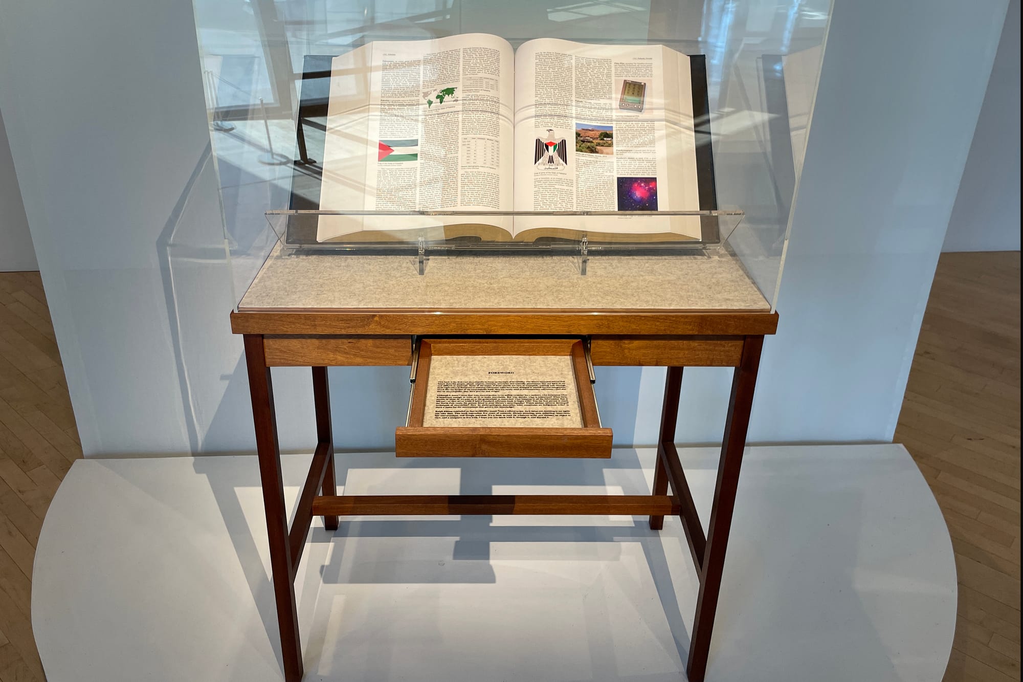 The work of the two Black artists in the 13-person show is housed in the larger section of the gallery. Tavares Strachan’s “The Encyclopedia of Invisibility” (2018), a 2400-page tome dedicated to intangible sensations and overlooked histories, is poignantly displaying the entry for Palestine, and because the book is protected behind glass, no one can erase its existence. Behind the book, in its own nook, is Sondra Perry’s “Double Quadruple Negative Etcetera I & II” (2013), a two-channel video installation in which two dancers flail about, an AI-driven tool rendering them a fast-changing patchwork of drywall. All that identifies them as Black is their hair texture and the occasional blurred forehead, a rare instance in which big tech is used to protect rather than exploit.