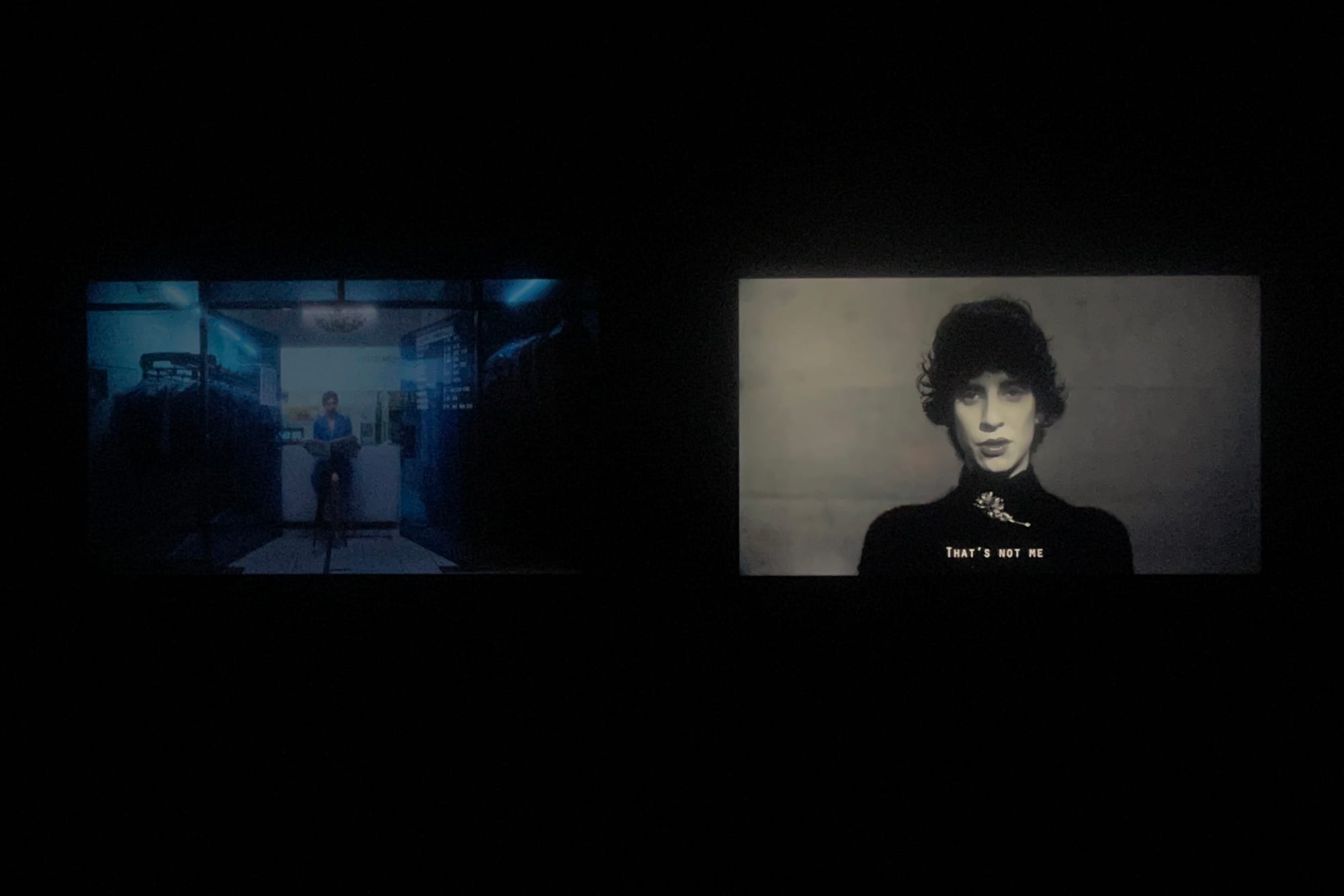 Another captivating two-channel video that leverages AI is an excerpt from “Soft Evidence” (2021) by the art collective Operator (Ania Catherine and Dejha Ti), which shows the same woman in different settings. In one channel, she’s reading a newspaper in an eerie drycleaning shop. In the other, the woman stares blankly at the screen. “That’s not me,” she says in a monotone, seemingly referring to the fact that she doesn’t actually exist: The entire film is quite convincingly deepfaked.