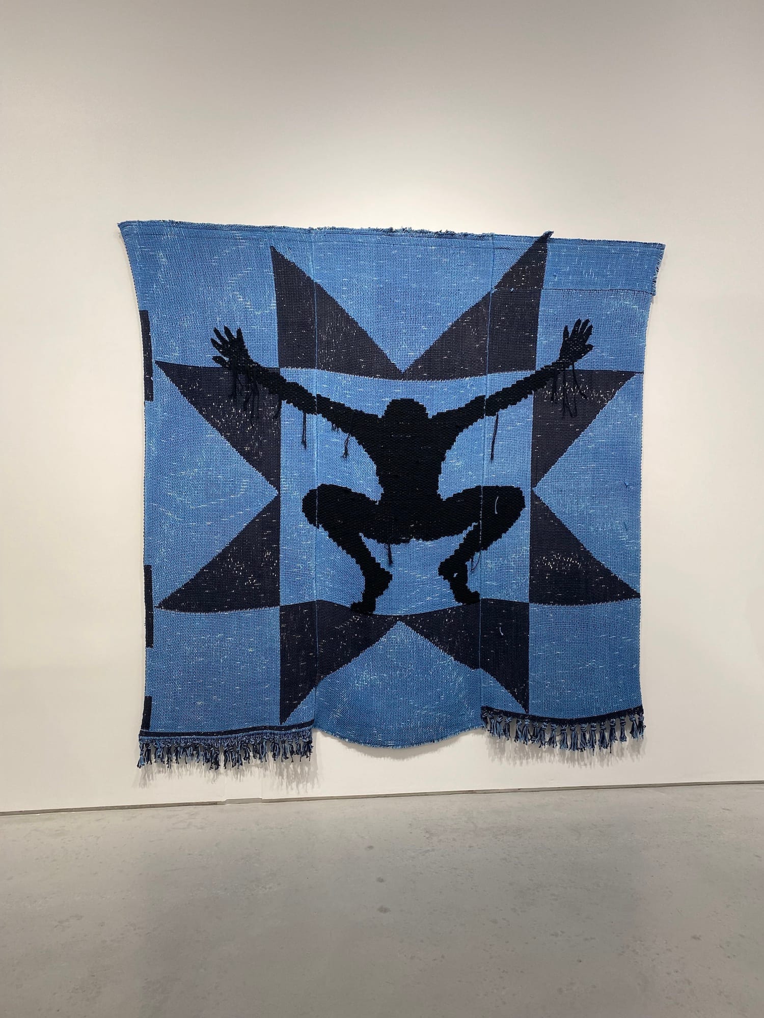 Tapestries also figure throughout the show. In “Ctrl+Alt+Del” (2021), Qualeasha Wood weaves cotton jacquard and glass beads into a self-portrait decorated with MacBook icons, emojis, and clouds. Her signature cyber aesthetic reflects on the representation of Black femmehood and interrogates the way that it is consumed and exploited in popular culture, both on and offline. Meanwhile, Diedrick Brackens’s deep blue tapestry, “survival is a shrine, not the small space near the limit of life” (2021), depicts a black silhouette of a figure with outstretched arms crouched in a squat; the figure appears almost paralyzed, suspended between an expression of freedom and one of upholding an unbearable weight.