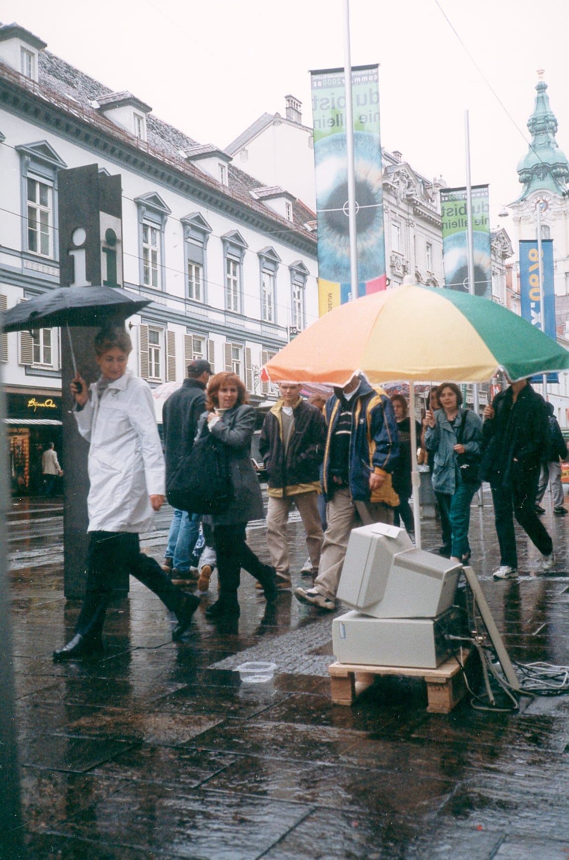 Net art addresses a similarly phantom audience. Elevated to the status of museum objects, the works in The Art Happens Here receive public recognition they were not made to expect. Active all day (and perhaps all night?), their host devices labor and hyperventilate: Give Me Time/This Page is No More’s projectors overheat, their fans cooling frantically as they shutter through the show.