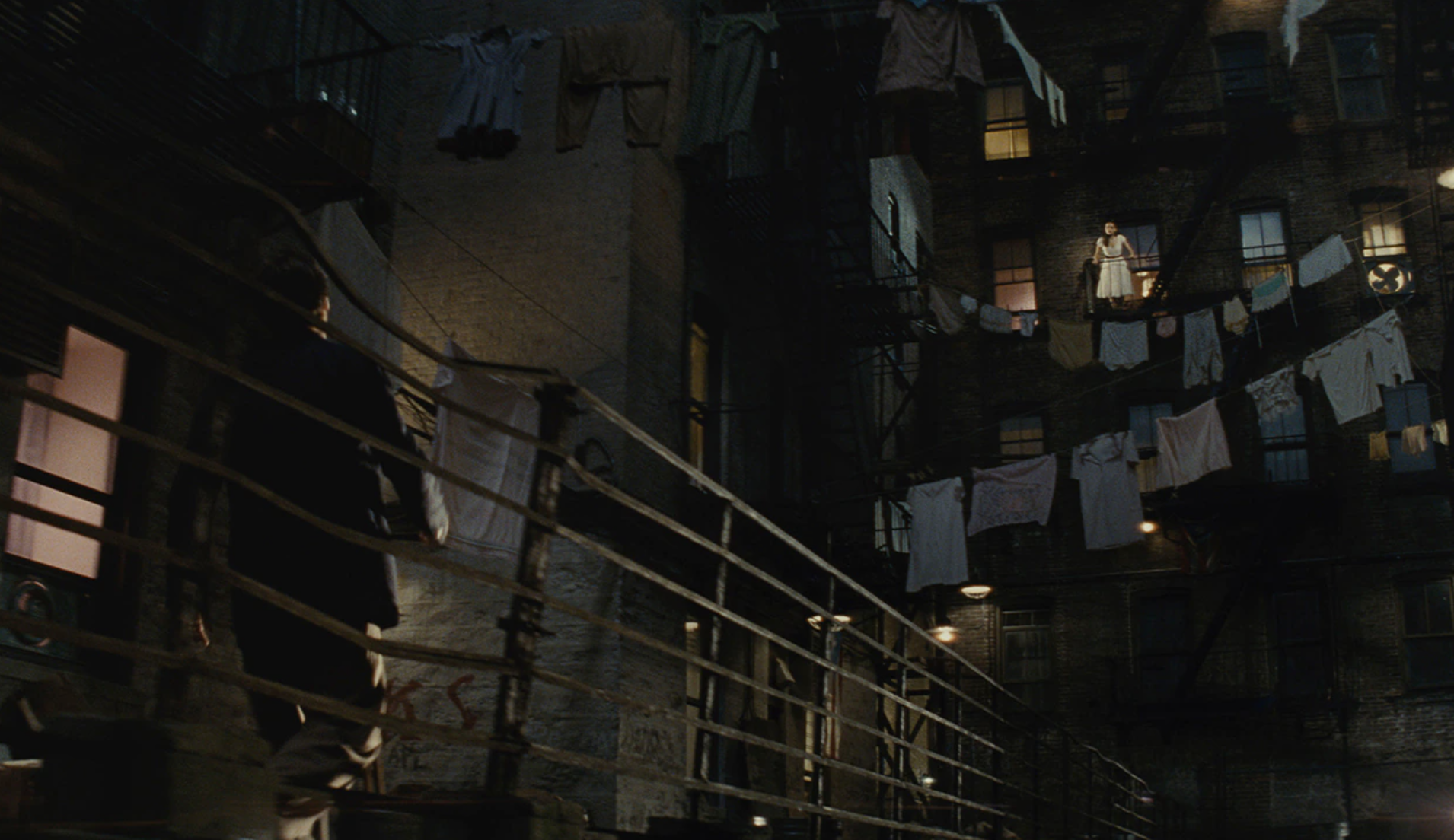 In this iteration, the characters are more concretely and pointedly delinquent teens, not the quaint greasers of so many high school productions. The Jets take as they please, stop traffic when they cross the street, and punctuate the wordless opening musical sequence with a vandalism hate crime. Ignorant of the policies of city planner Robert Moses (in a way, an unseen “bad dad” of all New York City; the film's opening and closing crane shots are like the eyes of the state looking down on the characters), they blame Puerto Rican immigrants for threatening to displace them from their neighborhood. Local police officers are all too happy to perpetuate this fear, and to mock their familial troubles. These are the only consistent male authority figures in the story, but they don’t make for good role models, alternately encouraging the Jets to harass immigrants and punishing them for their domestic dislocation.