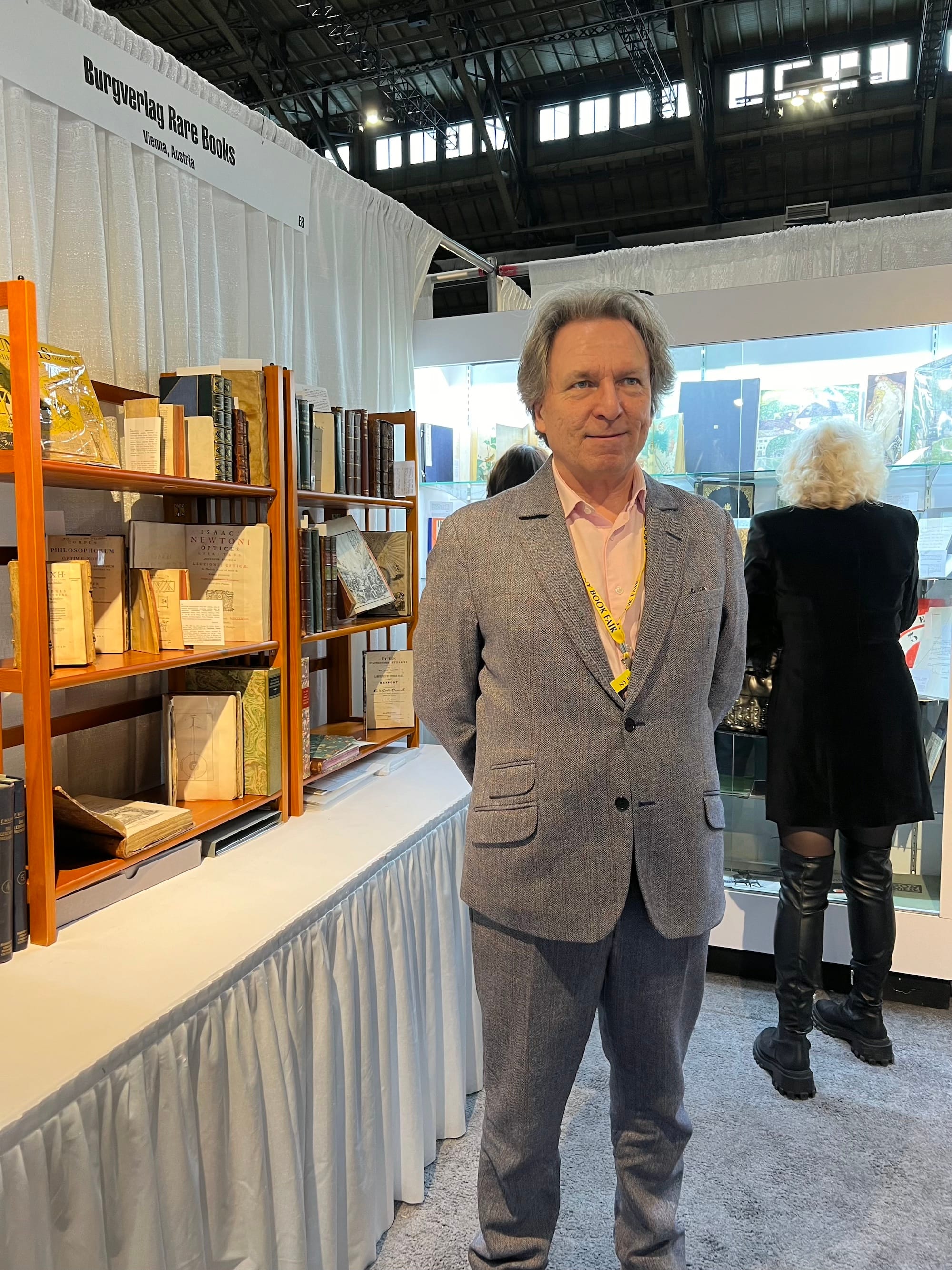 "A quote about what?" Schoisengeier asked. "Oh. It's one of the most important antiquarian book fairs in the world. For a European like me, it's always attractive to come here, meeting customers and clients who won't easily come to Europe. It's a good meeting point. There's a lot of exchange. Is that okay?"