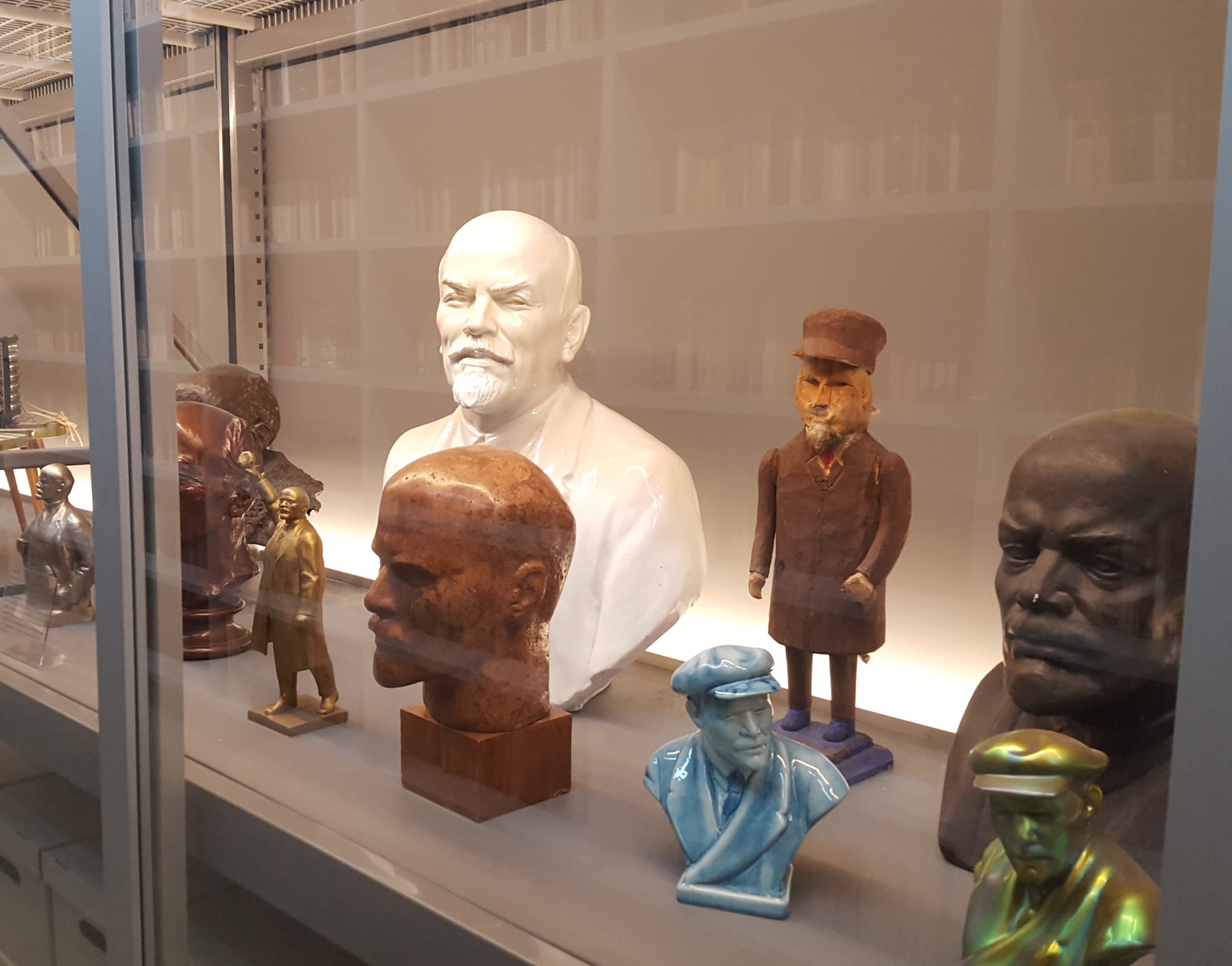 On either side of the main thoroughfare, thousands of Soviet-era books are stacked on shelves lining the outermost walls. (They are not yet sorted, a testament to some ongoing growing pains.) Opposite them, the museum’s storage boxes can be seen behind glass dividers, along with examples of the collection on display: Soviet-style furniture, toys, and radios. One case contains various busts of Lenin, a small sampling of the more than 100 the Wende has. The curators plan to bring in algorithmic experts to ascertain whether subtleties in the ways different artists rendered Lenin’s expression can help determine which country each bust was made in.