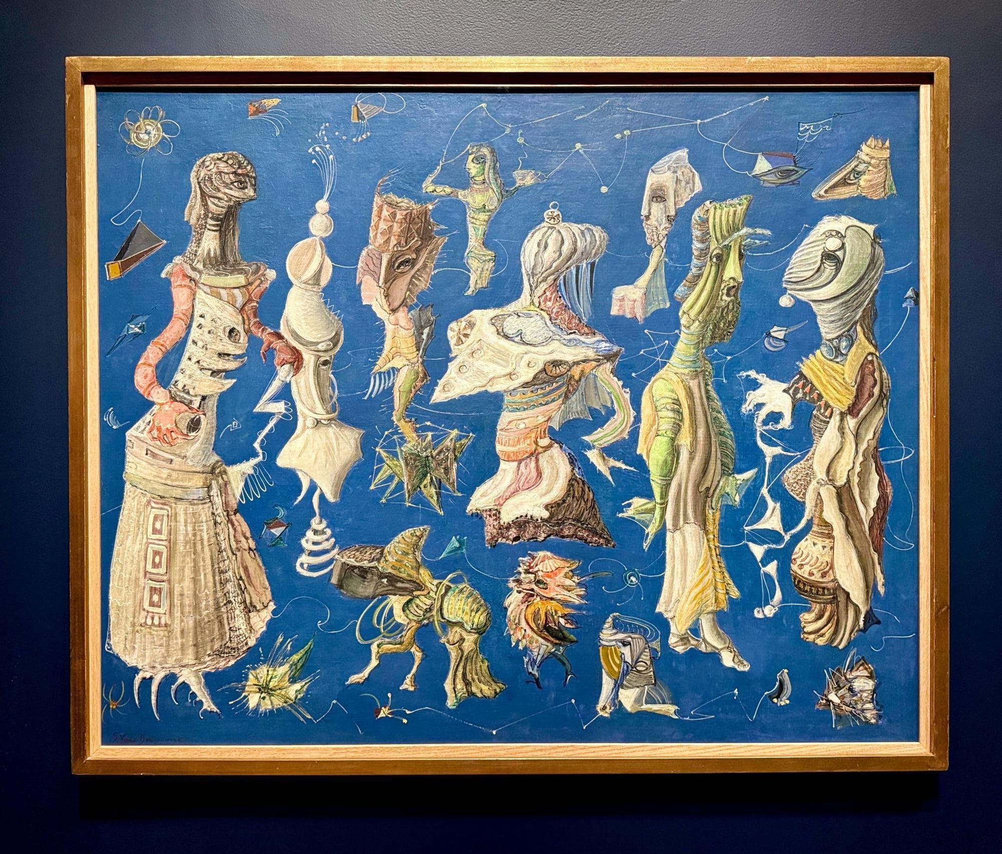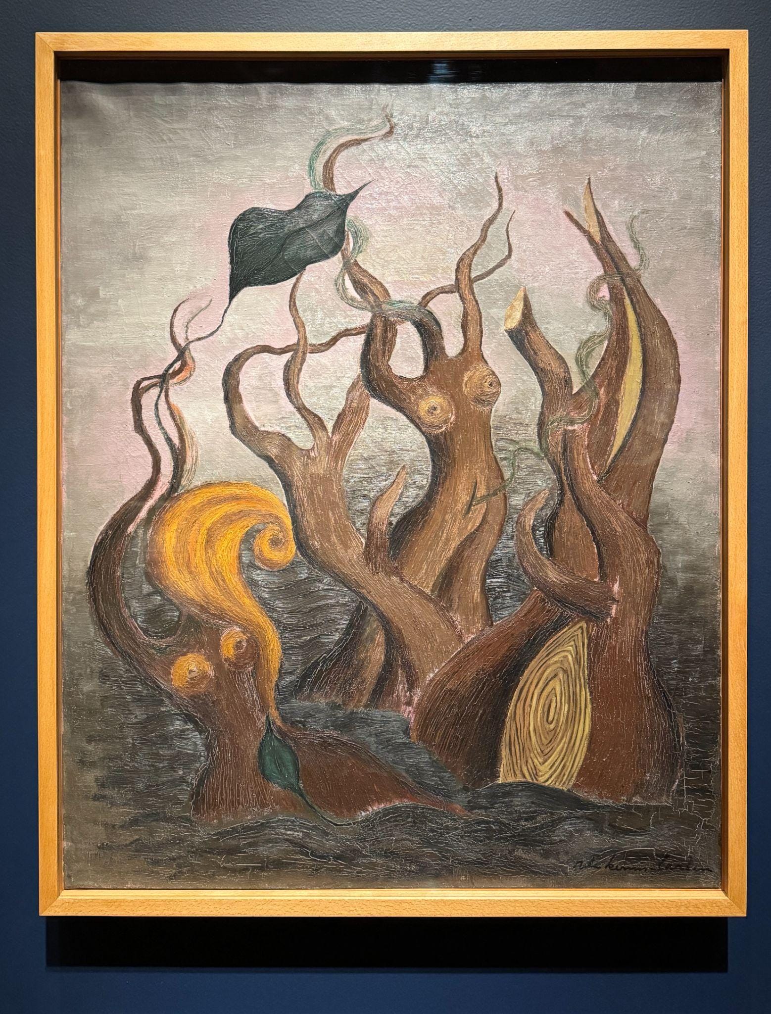 But — what is their story? Too often, the didactics contain barely any information. Who is Rita Kernn-Larsen, the rare woman in early European Surrealism, who grew up in a castle, and why did she title an unnerving 1940 painting of drowning, headless, humanoid trees grasping at the sky “The Women’s Uprising”? Why go to such lengths to include niche delights such as Suzanne Van Damme’s “Surrealist Composition” (1943–47), a floating coterie of alien creatures, if we learn nothing about who she was? How are we to thoroughly understand Surrealism’s adventures into the unconscious without learning about its origins in Breton’s work as a doctor treating traumatized World War I veterans? And how can one invoke these artists’ opposition to the specter of fascism while glossing over the very different and far more disturbing politics of Dalí, who is so prominently featured in the show?