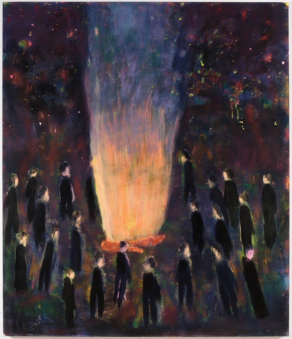 Looking at the appropriately titled ‘Bonfire” (2016), you would most likely ask why all those dark-haired men in suits and long black coats are circling a huge bonfire? Each of paintings evokes a nocturnal world (a kind of Hades for swimmers), where death, violence, and disaster seem to be inseparable from the circumstances. Despite the casualness with which everything appears to be painted, I was reminded of these lines from William Butler Yeats’ poem “Easter 1916”