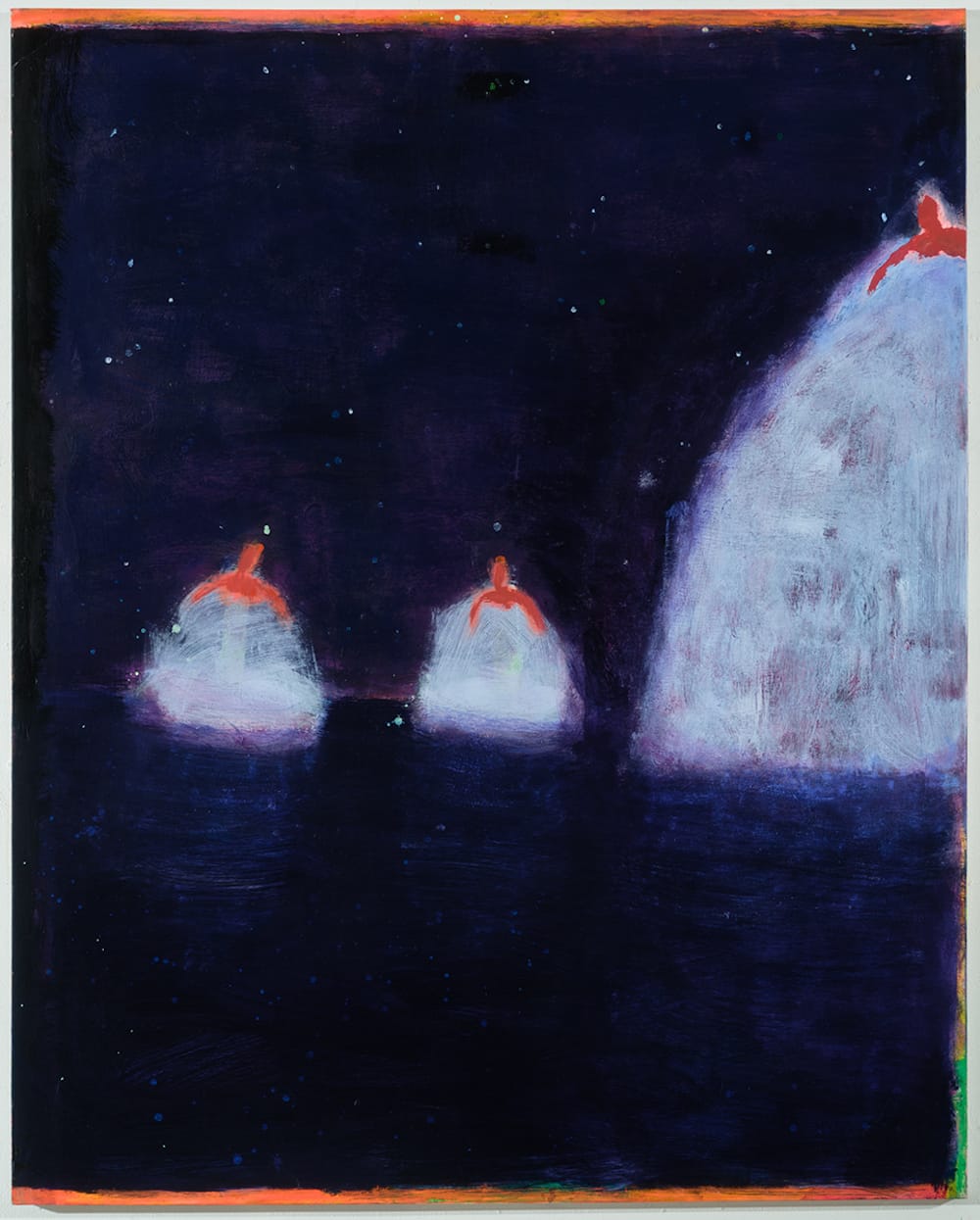 What about the body arched just below the water in “Shell Seeker, Large Night” (2016)? That arched pose recalls that moment in sci-fi films when the characters are transported onto the alien spacecraft hovering above.