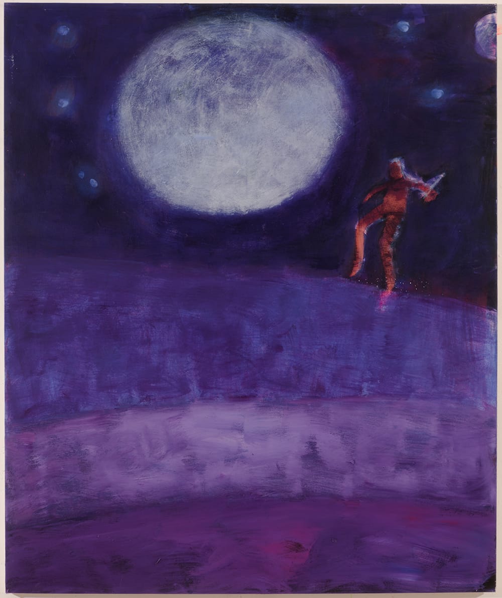 In “Moon Jumper” (2016) a figure seems about to leap free of three wide, brushy bands in different hues of violet stacked on top of each other. A full moon floats above and to the left of the long-legged, featureless figure, who is holding what could be a wand or a giant pencil. Again, Bradford adds nothing to explain the painting, or even tries to give it a context. We feel as unmoored as the jumper.