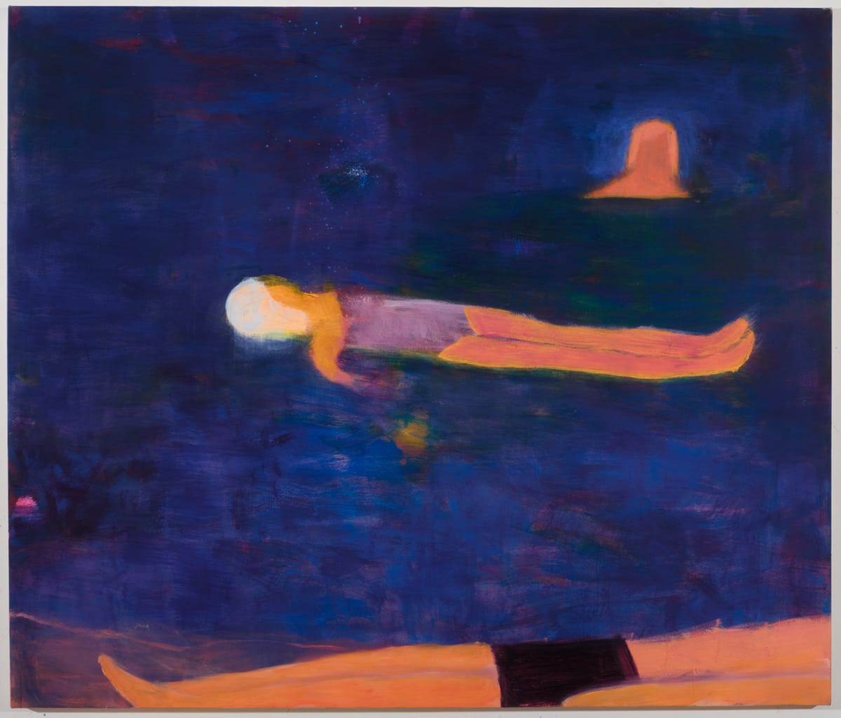 When Bradford crops the head of the man lying along the bottom edge of “Pond Swimmers” (2016), she introduces a note of unexpected and unexplained violence. Who lies sunbathing at night? The woman floating on the water in the middle of the painting is unaware of anything or anyone else: she is literally and metaphorically in her own world, as is the figure above her, facing away and approaching the upper right-hand corner, with only his head and a part of his back visible above the dark blue water.