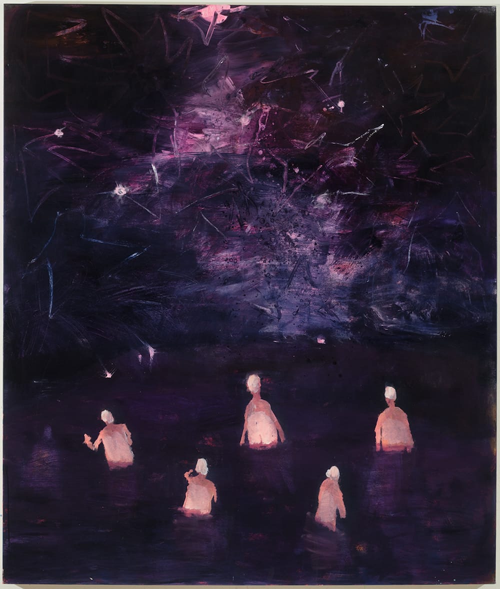 In “Storm at Sea” (2016), five dowdy, white-haired figures (or are they wearing bathing caps?) in flesh-colored bathing suits are standing in the bottom half of the composition. They are facing a series of scratched lines and agitated brushstrokes above them, seemingly unable to decide what to do next. There are at least six reflections for the five figures, with the one on the far left unattached to any body.