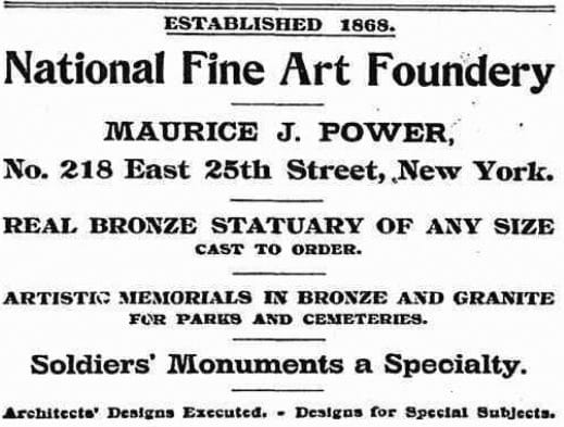 As with their zinc counterparts, these soldiers were often made in close likeness of those produced for the North. The monument in Oakdale Cemetery in Wilmington, North Carolina, erected in 1872, is a facsimile of the Union soldier appearing on a monument at the Calvary Cemetery in Queens, New York, and at the Green-Wood Cemetery in Brooklyn, New York. Both were cast by the National Fine Art Foundry, located in New York City. (An ad for the foundry, published in the October 9, 1892 edition of The Sun, a daily newspaper published in New York until the mid-20th century, reads: “Soldiers’ Monuments a Specialty.”) As Beetham points out, the only difference between the two statues are the initials on the belt buckle: one reads “US,” while the other reads “CS.” Another replica of this same statue, as a Confederate soldier, was erected in Greensboro, NC, in 1888. A modified version in a different pose, also produced by the National Fine Art Foundry, appears in Forsyth Park in Savannah, Georgia (1879).