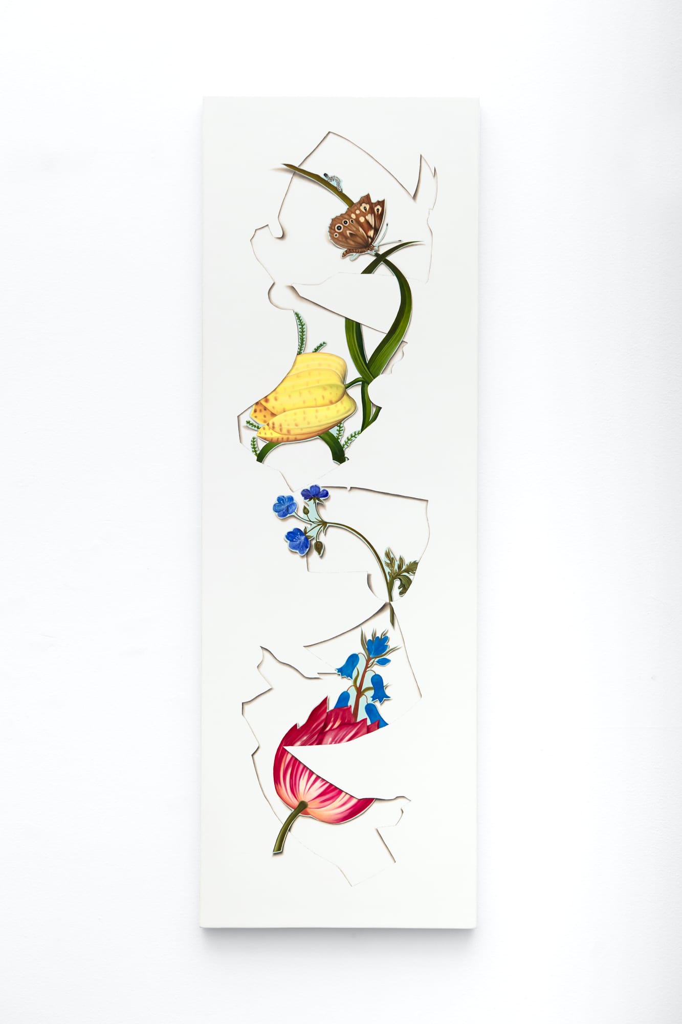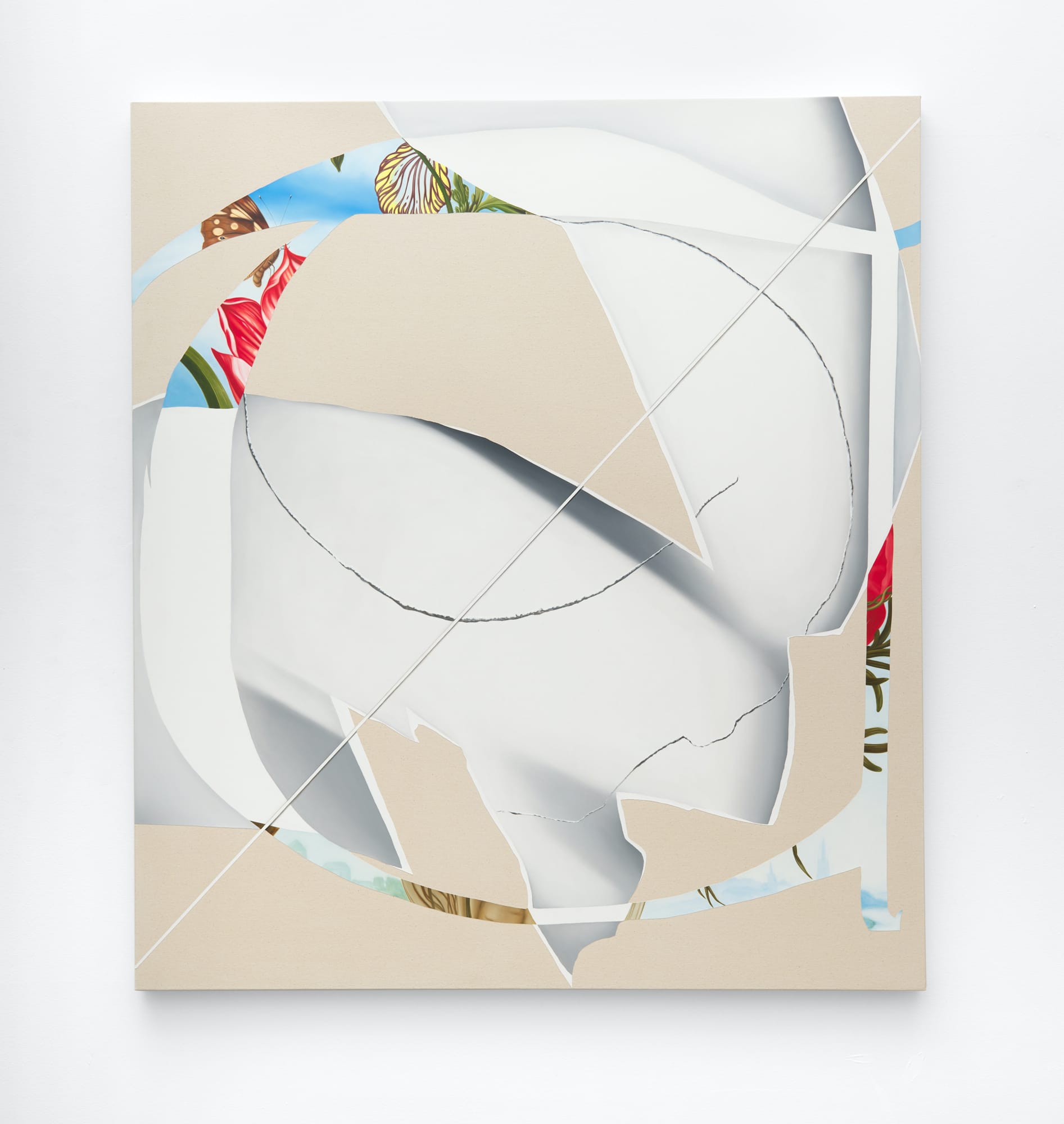 I found “Bouquet (After Ambrosius Bosschaert)” to be at once frustrating and pleasurable. I could see what Halter was up too, but, at the same time, the cutout sections of paper made it impossible to grasp what the entire bouquet looked like; this impossibility seems to be one of his preoccupations. A meticulous painter who seems capable of copying a baroque work with remarkable accuracy, I think Halter knows that being able to convincingly recreate the style of a classical master is not enough. By bringing in trompe l’oeil effects, he appears to simultaneously undercut and celebrate his own deftness. But this is not the main reason I have followed the artist for the past decade.