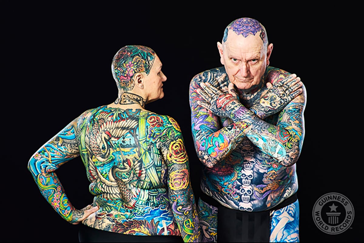 Charlotte Guttenberg and Chuck Helmke from Florida currently have 97.5% of their bodies covered in tattoos. The couple first became interested in tattoos well over the age of 50. Helmke also holds the record for most skulls tattooed on the body (376).